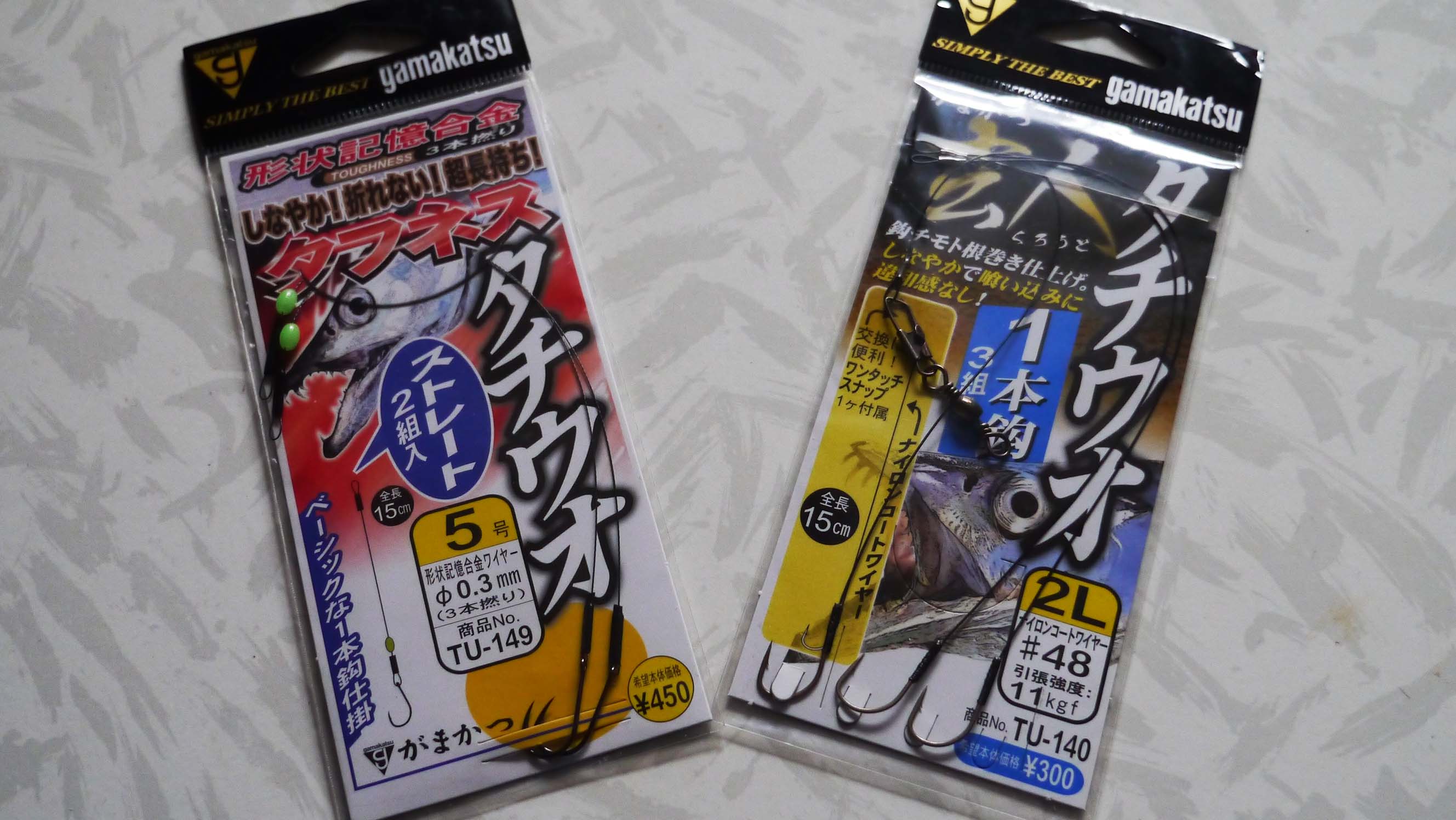 以前は自作していたのですが、がまかつから同じ様な仕掛けが出てから使い始めました。玄人タチウオは2009年に発売されて以来、常時使っている一番のお気に入り。タフネスタチウオは2012年の発売で、今ではこちらも時々使っていますが、一本のハリで10本くらいのタチウオを釣る事が出来る優れものです。