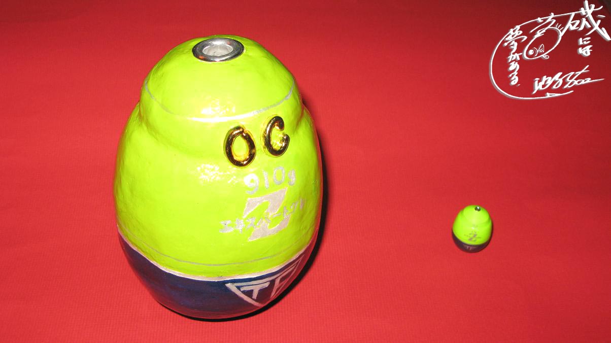 写真の“ななめウキ”は釣研の特大ウキです。実際に使っていた“ななめウキ”は“中”か“大”で、その当時は写真の様な大きい“ななめウキ”は出ていませんでした。当時の“ななめウキ”を探したけど、出てこなかったので同じ型・同じ色として、写真には特大タイプを代用しています。