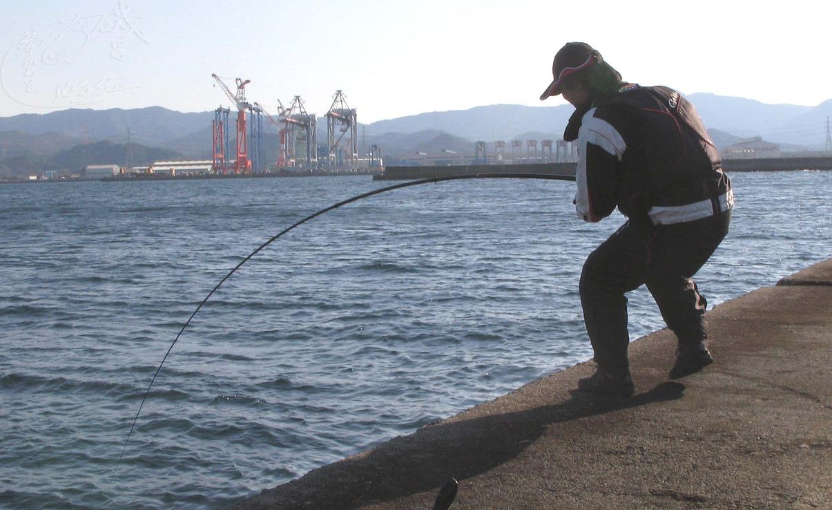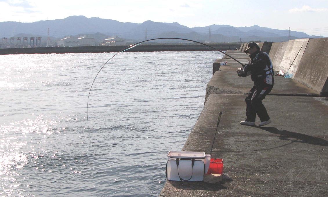 パワースペシャルフカセ5号が、綺麗に曲がってカンダイの疾走を食い止めています。フカセカンダイで新しい年の釣りがスタートです。カンダイの釣り方はココです