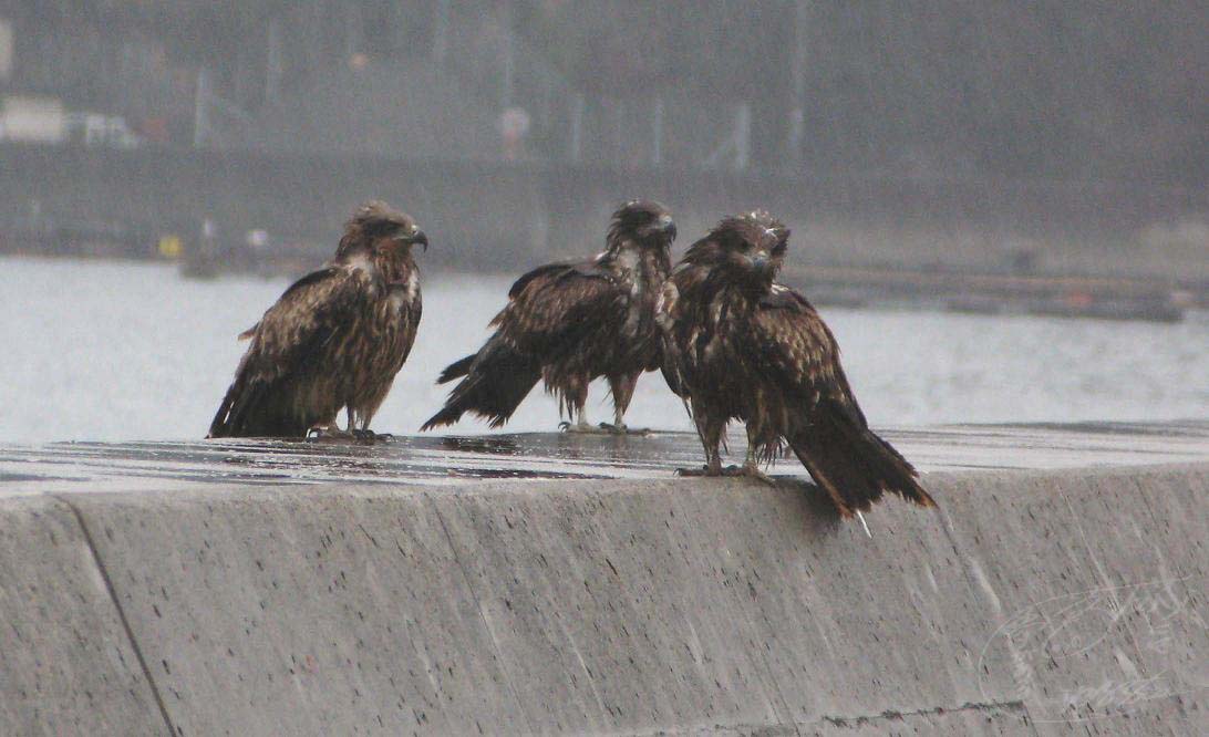 ずぶ濡れに耐えているトビたちです。