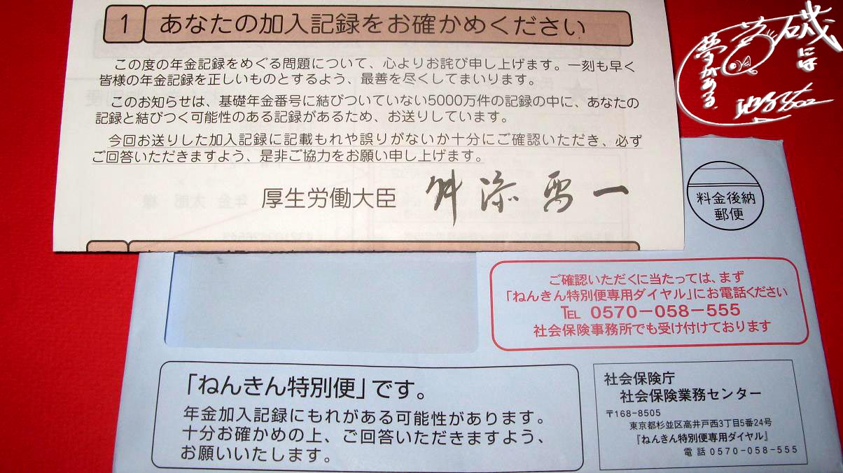 昨日の出来事、社会保険庁から“ねんきん特別便”が届いていました。