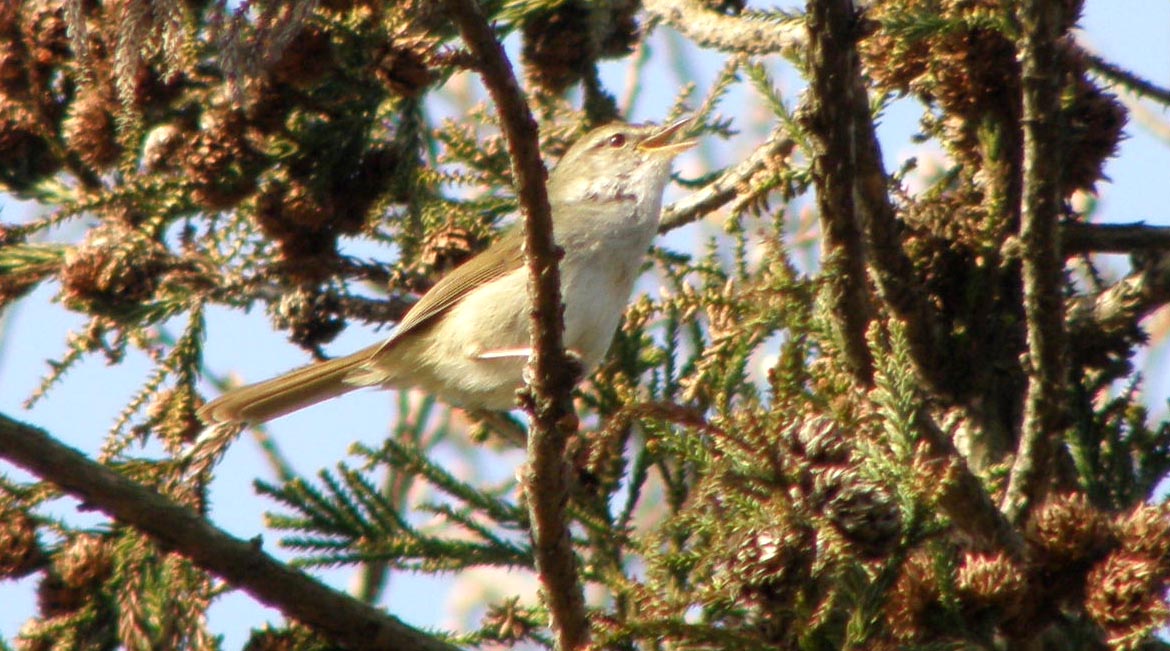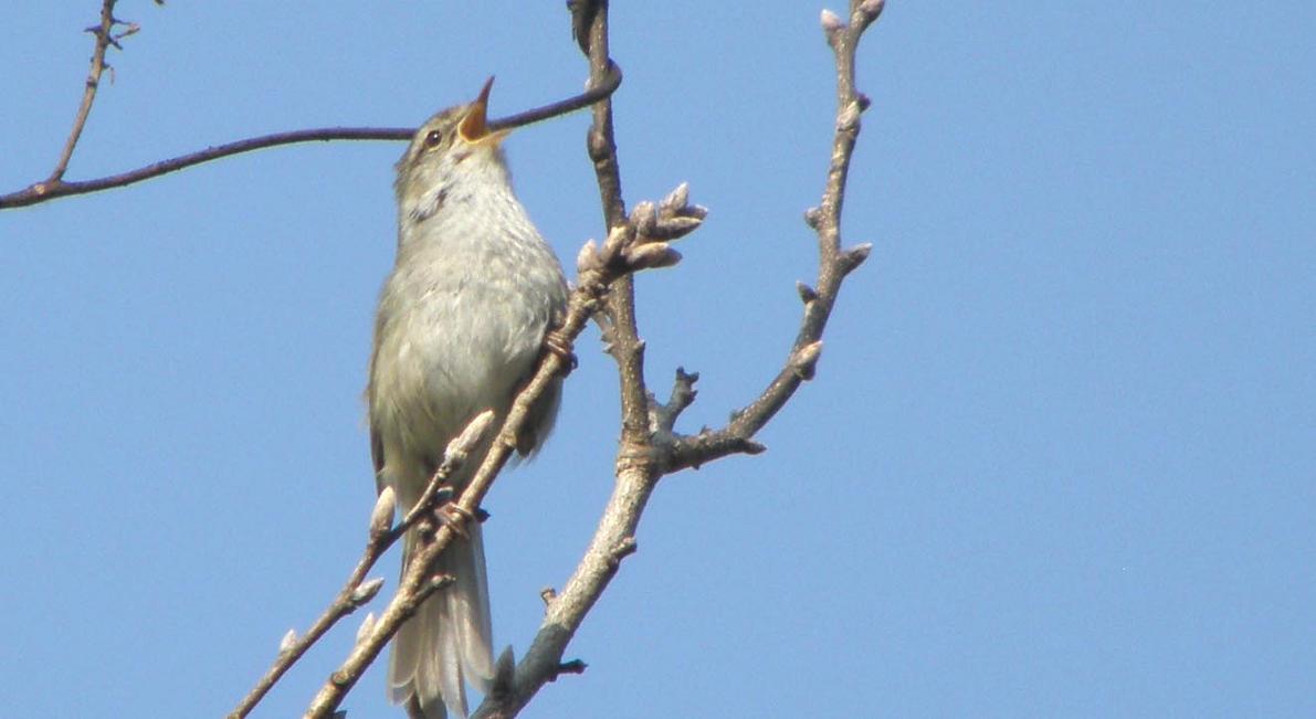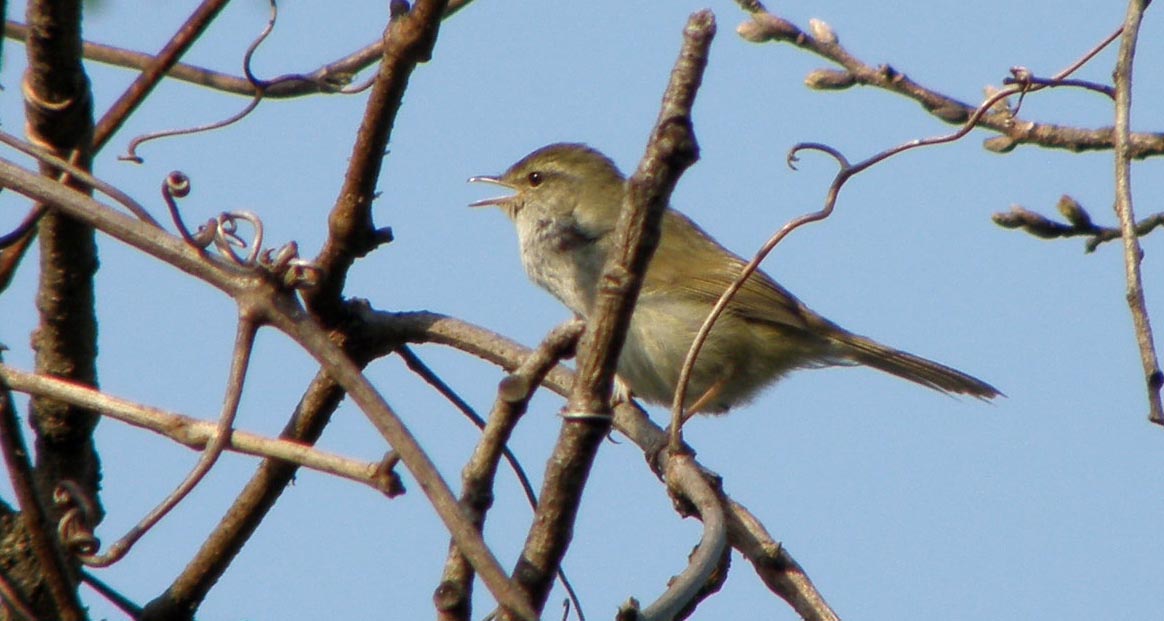 今回はウグイスの鳴き声ですが、囀りは皆さんご存知の通り“ホ~ホケキョ”です。その囀りの間に、早口でキョキョキョキョキョケッキョケッキョなどと鳴きますが、これはウグイス用語で“谷渡り”と言います。警戒した時に良く鳴く言葉です。条件次第で、これらは400~500mくらいは聞こえる大きさでしょう。