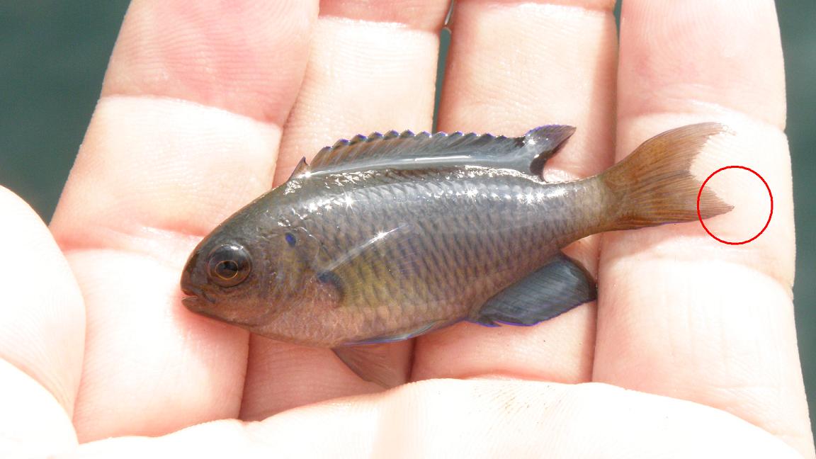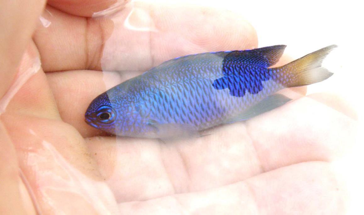 見分けの根拠は尻尾、ソラスズメダイは2葉に分かれた尻尾の先端が尖りますが、ルリスズメダイは丸っこいか、2葉に分かれても丸っこい尻尾になっています。