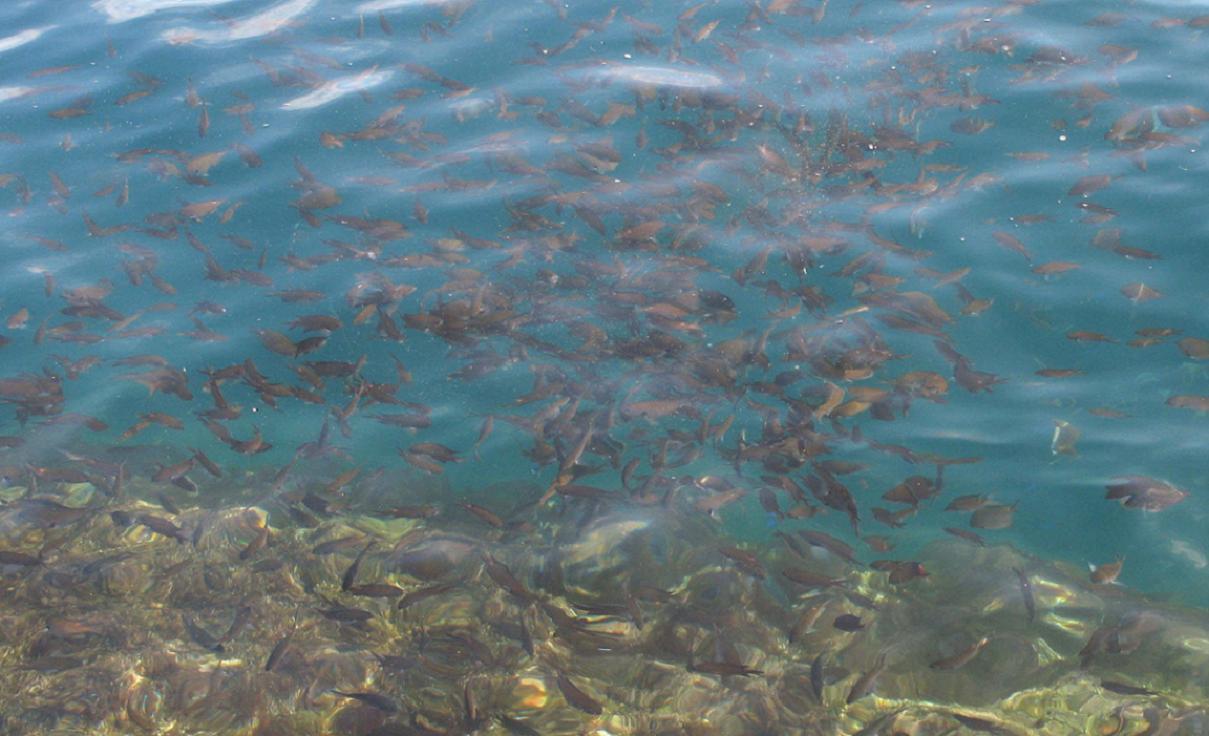 スズメダイの群れ。西九州では、このエサ盗りを交わす事が重要です