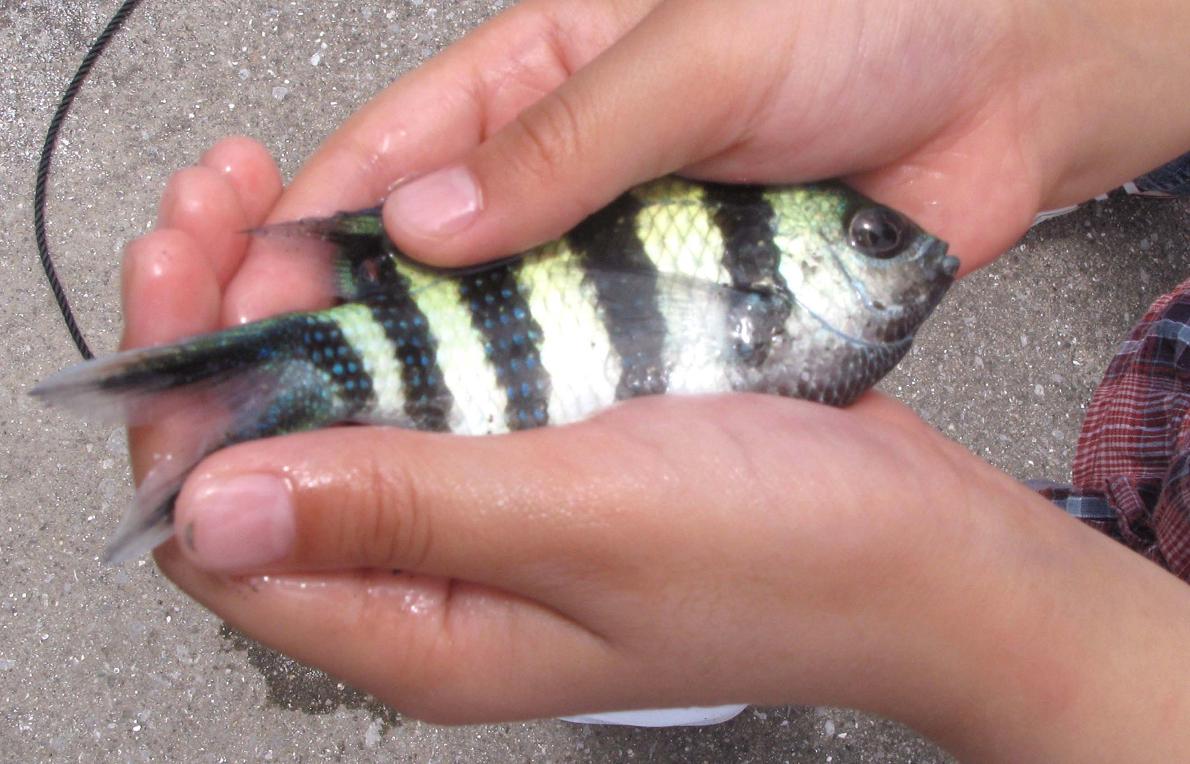 狙いは熱帯魚、ソラスズメダイやシラコダイ・チョウチョウウオ・ツノダシなど・・・でも釣れるのは違うお魚さん達です。ハリセンボンはタモで掬いました。ボラは私が掛けて、みんなで釣り上げました。
