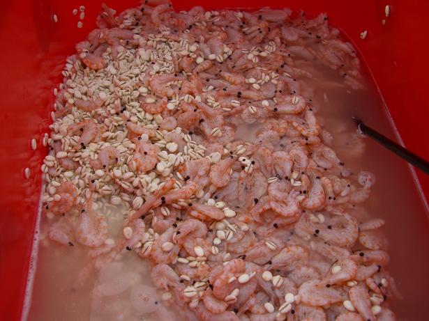 混ぜる比率はエサ取りの種類や量(主にアジゴ)によってムギが変動する。ボイル3Kgに対してムギは2~6Kgくらいかな。