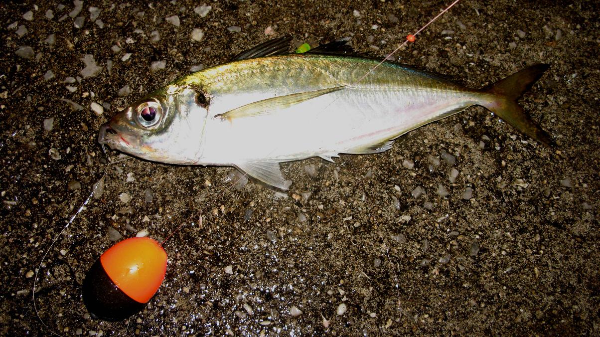 結果はタチウオのアタリは有りません。代わりにタチウオ仕掛のキビナゴを食って、釣られてしまったのは28cmくらいのアジでした。