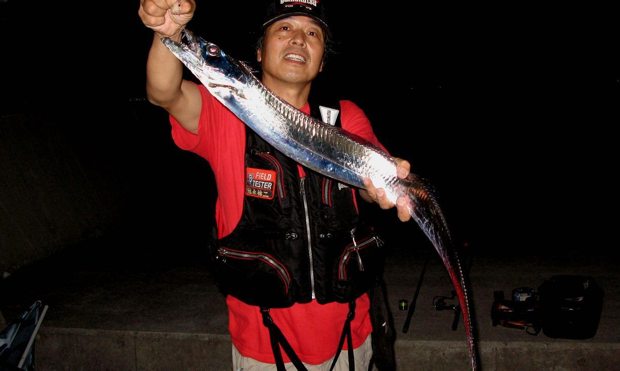 全遊動で使っている、電輝円錐ウキの動きがおかしいので、少し訊いてみると、タチウオがエサを食っています。少しずつ手前の方に来ている感じ、しばらくすると潜り始めたので、アワセを入れるとハリ掛かり。