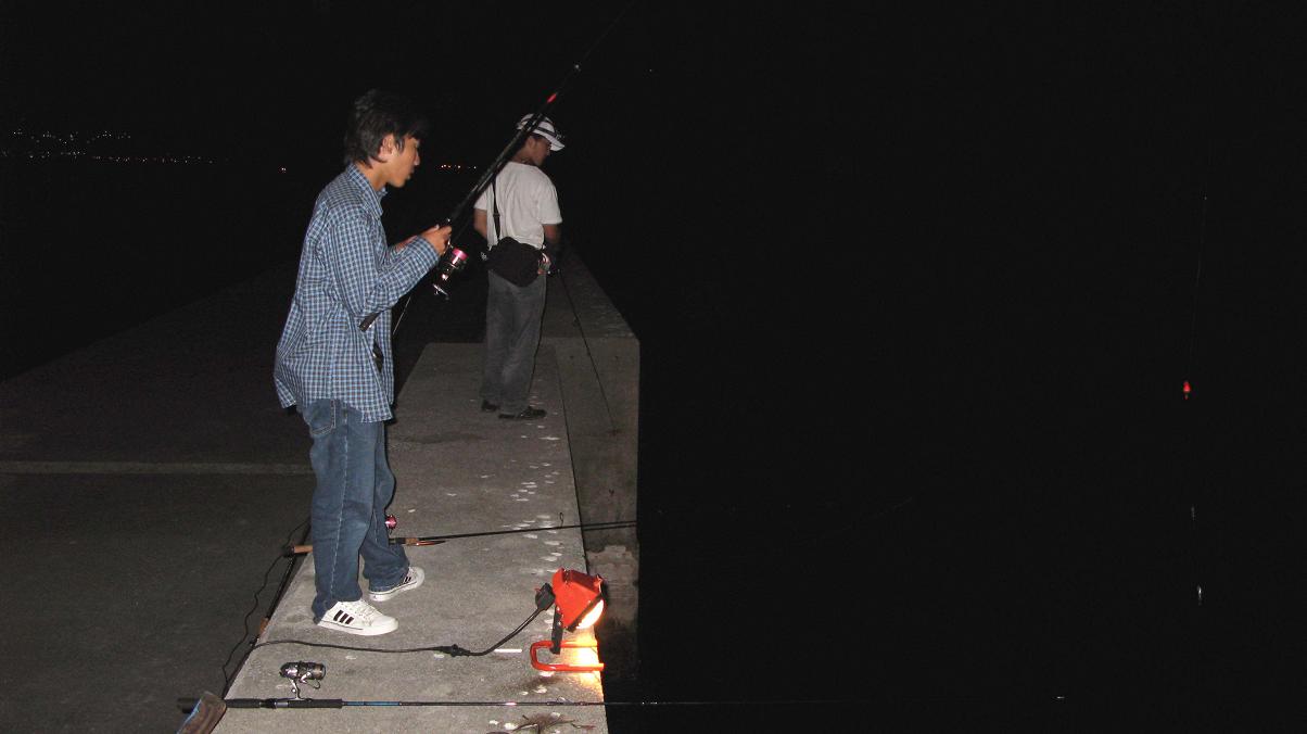 生徒達の釣りを見学して、19時過ぎに投光器を点けます。暗くなったので、キビナゴをエサに30m沖に仕掛けを入れます。投光器の灯りが効いてくるのはまだまだ先なので広く狙う作戦・・・