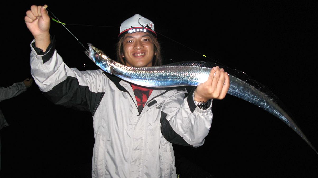 久し振りに陣取った白灯台なのですが、夜になっても常夜灯は点いてくれません。仕方ないので、持ち込んだ500wの投光器を点灯させ、タチウオを狙います。でも常夜灯が点いていない場所に、タチウオは回遊コースを設定していないのか、アタリはわずかに3度だけ、1匹の釣果で終わってしまいました。