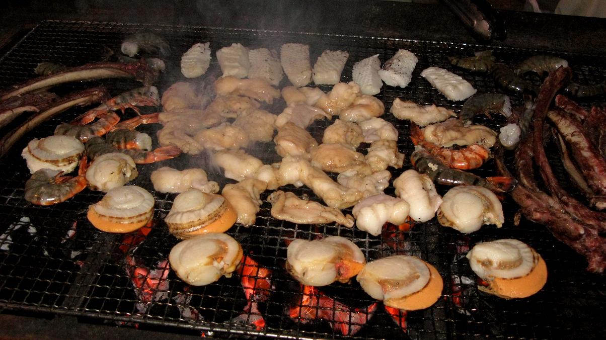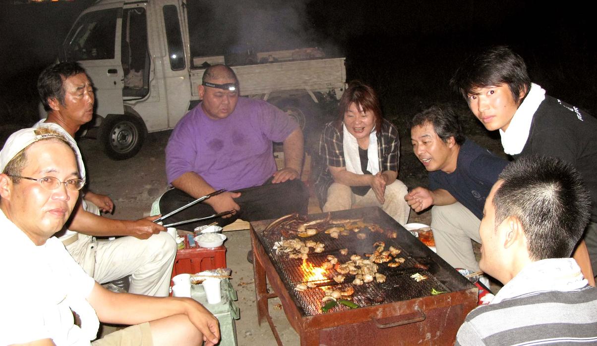 景気付けに仲間達からの焼肉壮行会!!府内大橋の下で、イノシシやら魚貝類・スイカなど腹一杯ご馳走になりました。