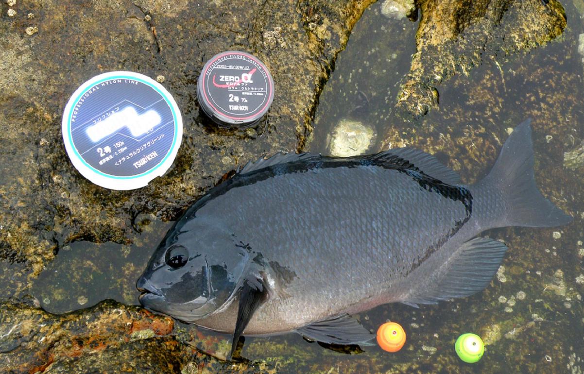 わざとタックルの条件を悪くして、現在の細いラインがなぜ多用されているかを検証したのです。でも、釣り場の条件は無風・ベタ凪・エサ取りなしとバツグンで、こんな異様な仕掛けでもグレは喰ってくれました。