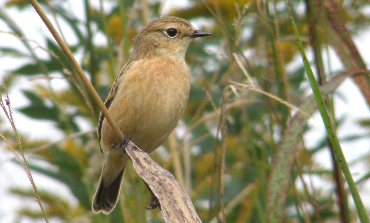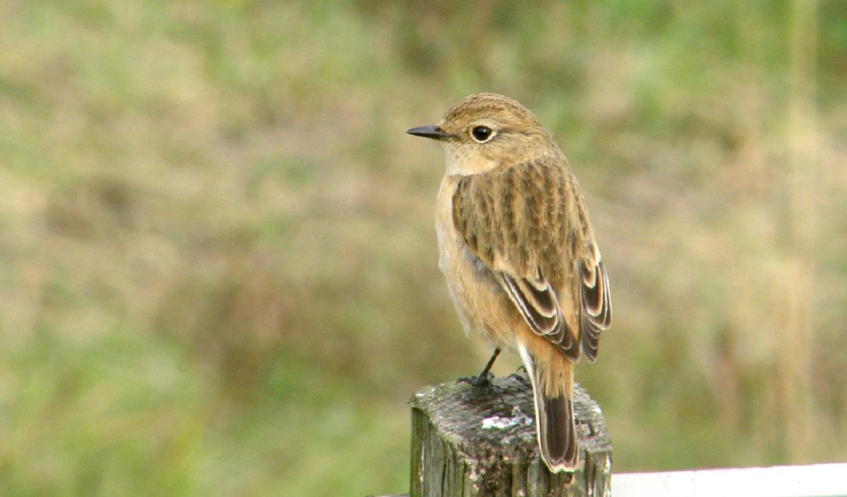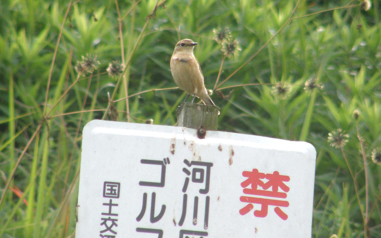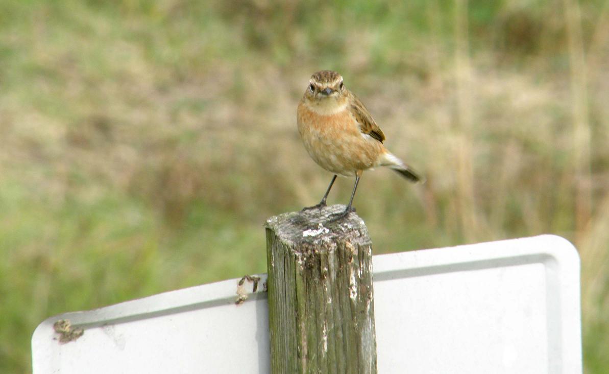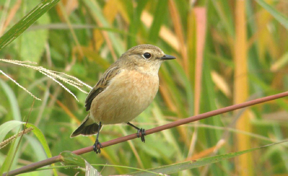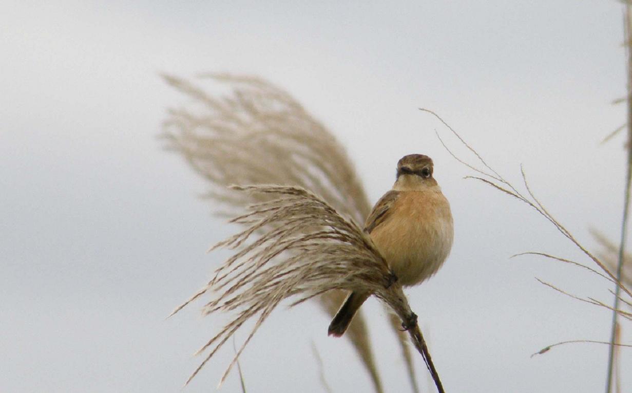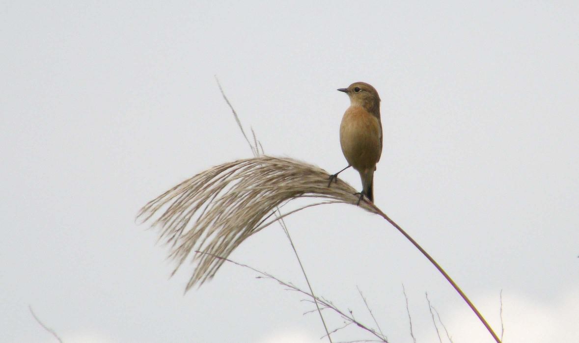 たぶんノビタキです。オスは特徴のある黒い頭と翼で、つい最近までそのオスを写真に収めている仲間がいます。でも今は全く見つける事が出来ません。・・・今は冬羽になって、メスと見間違う様になっているものと思われます。