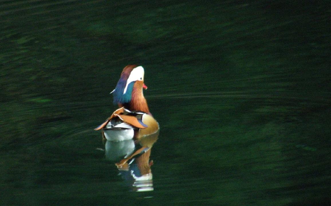 ・・・突然一羽のオスがこちらに飛んできました。シャッターを6回押しました。その途中に車のドアの音・・・人の声!!!オシドリは直ぐに立ち去ってしまいました。
