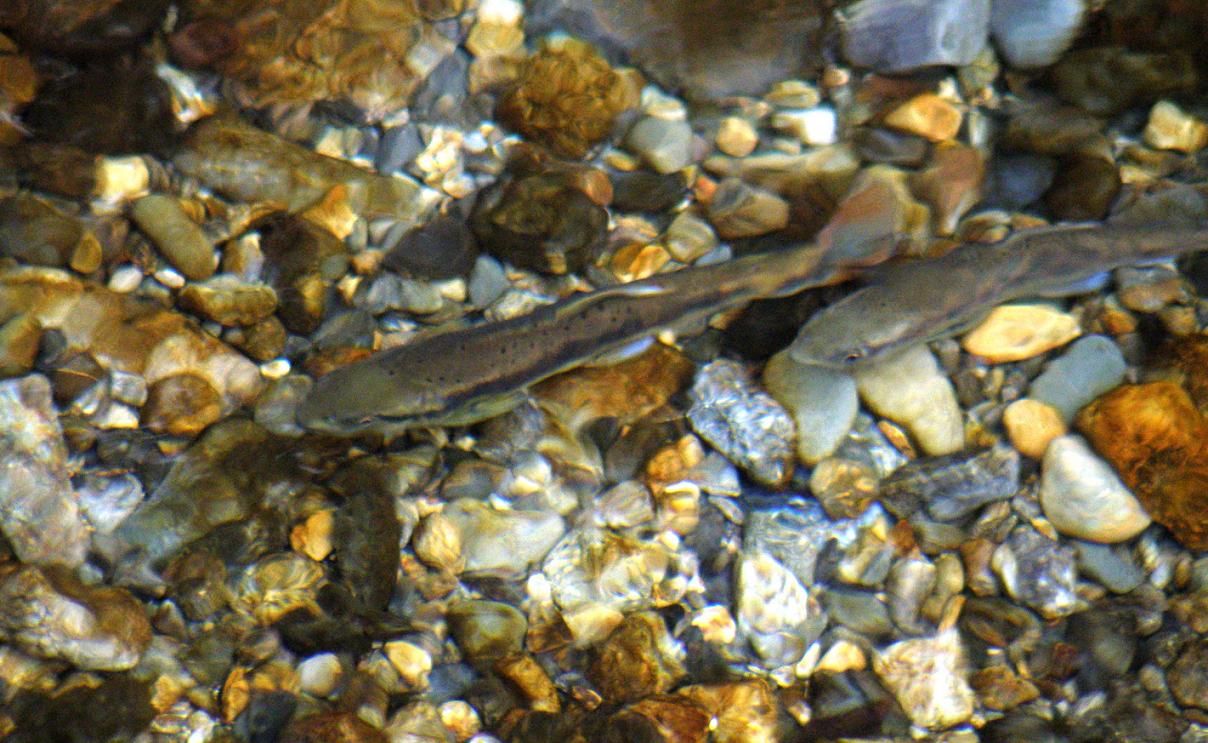 流れの中を覗くとヤマメの産卵床を発見です。少し待っていると一匹のヤマメが現れました。続いてもう一匹・・・この産卵床を作ったカップルでしょう。ペアーになったり一匹になったりしながら泳いでいましたが、やがて下流の落ち込みへと消えて行きました。