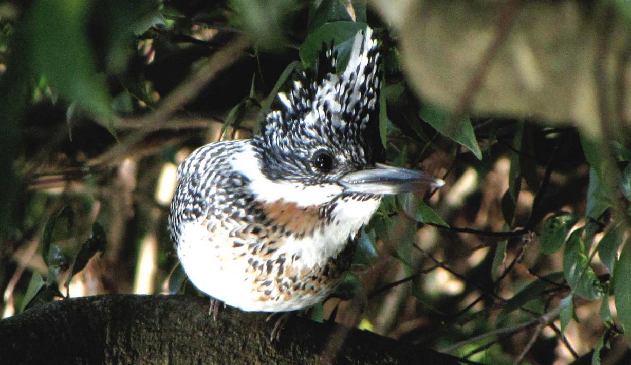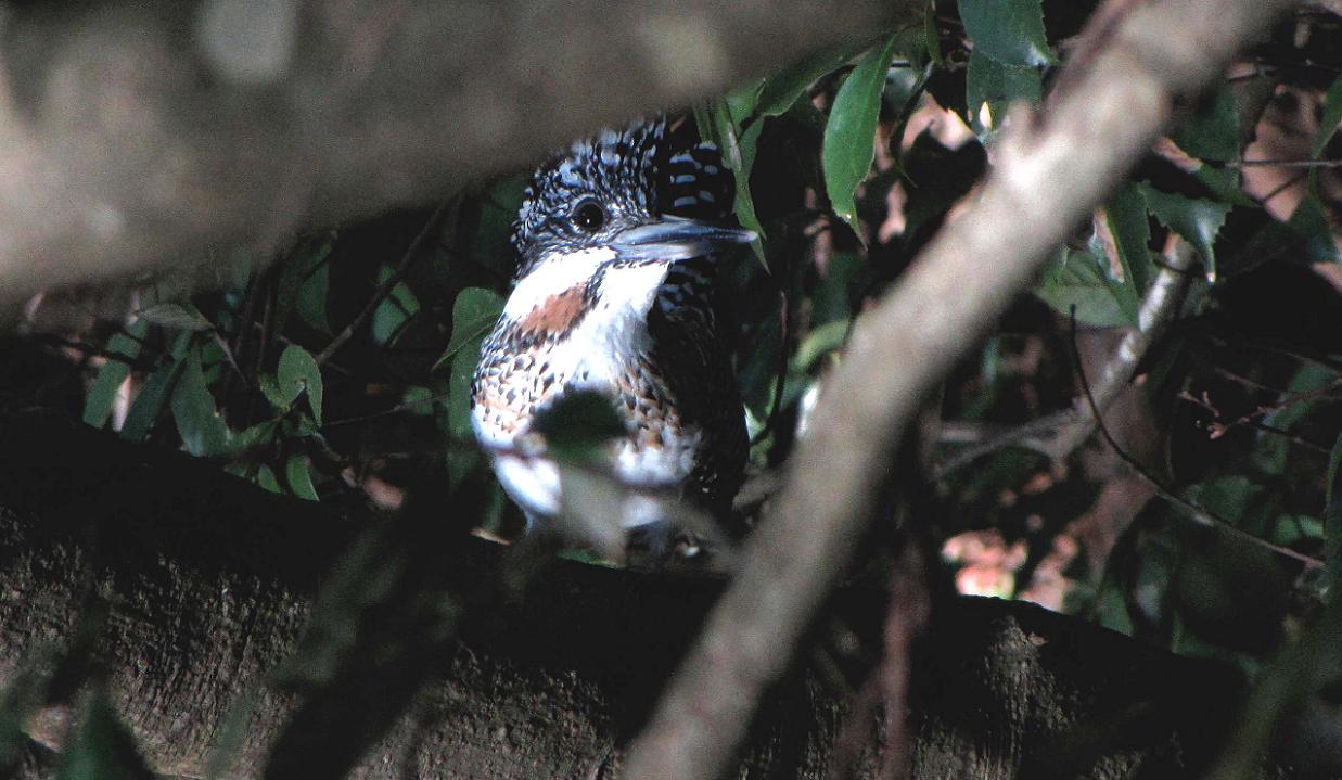 やむをえず、鉈を変な方向へ投げて、そちらでバサッと音を出しました。気付いたヤマセミは、無言で飛び出て上流へと去っていきます。今度は同じ場所から、休憩場所の蔓も写せる様に、葉っぱを取り除いて今日の鳥見を終了です。