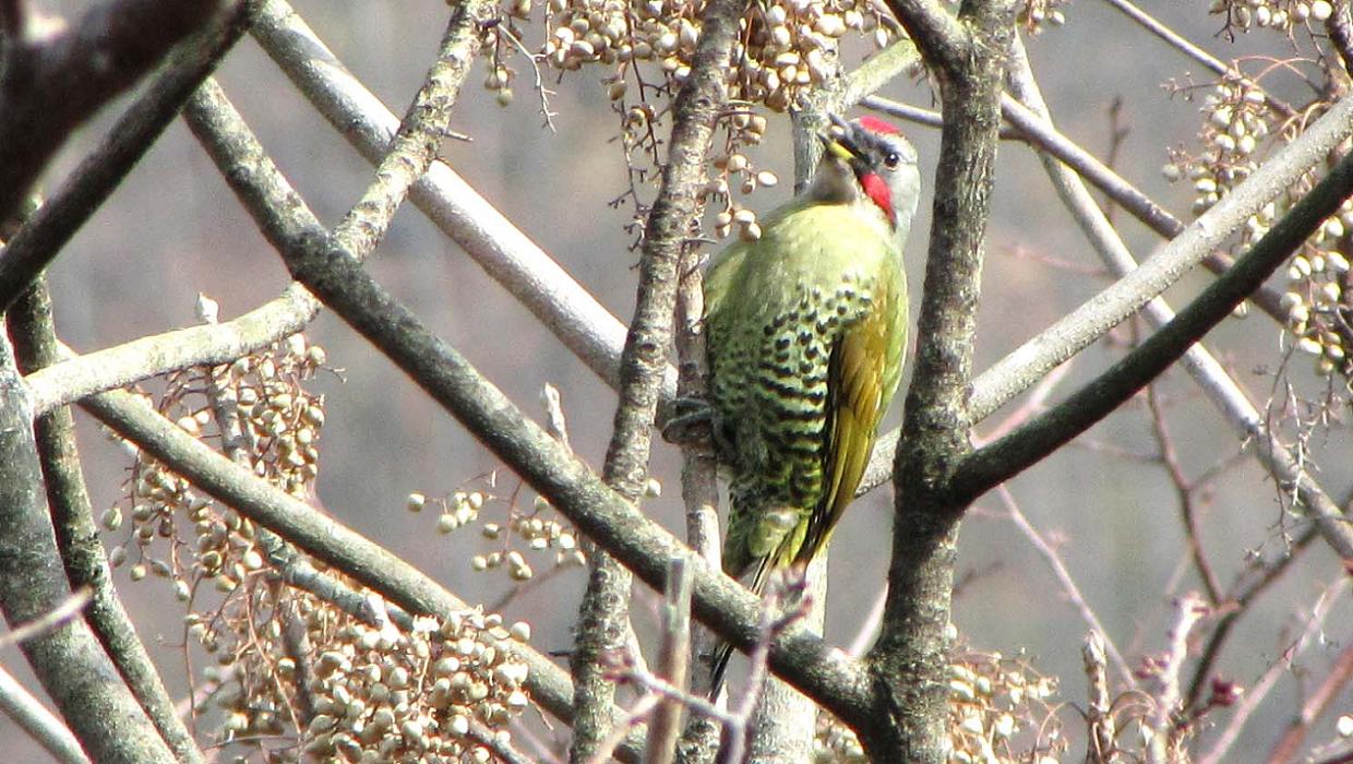 このアオゲラは今年の春に撮った個体と思います。他の鳥は羽音をほとんどさせませんが、アオゲラの羽音はかなり大きく、来た事が判断出来ます。留鳥だから一年中見る事が出来ます。