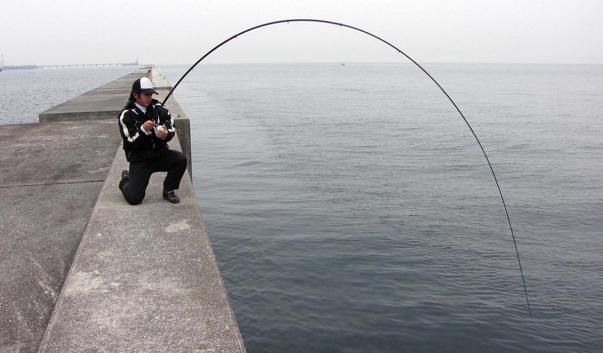 その後再度場所を変更して、今度は内側の浅場を攻めてみました。マキエを補充して、何度もマキエを打ちながら周到にタナを見極め、段差の潮溜りを狙っての第一投、ヤツは直ぐにやってきました。強烈な締め込みに追いかけるのがやっとです。しばらく走って、カンダイは底にへばり付いたのです。