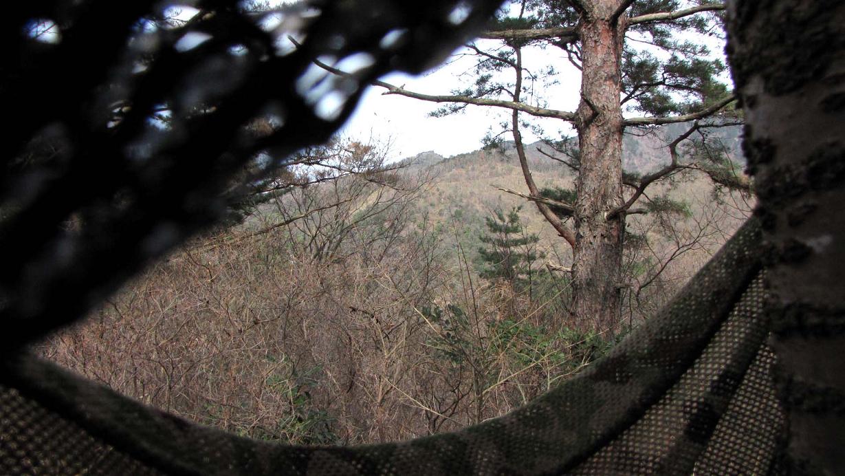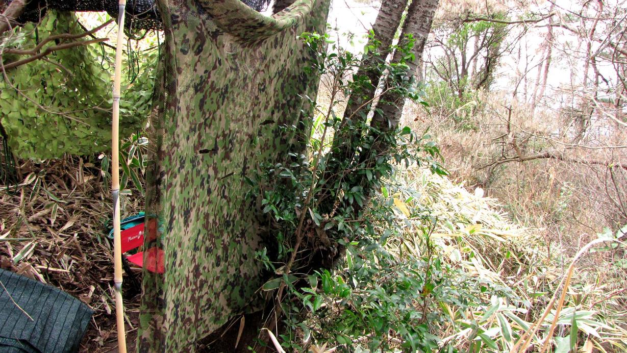 ウソを至近距離から狙うため、7時には現地に入りカモフラージュネットを張ります。少しして仲間のHOKKEさんも合流です。10時まで粘りましたがウソは現れず、一旦坊主山を退却です。