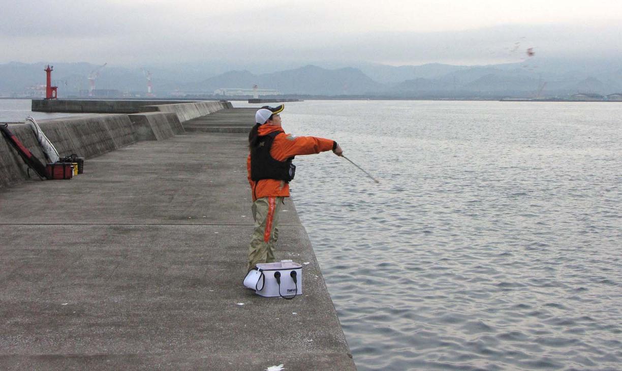 朝8時過ぎに大勝丸で渡り、一番最初に行うのは広範囲に打つマキエです。これは数の少ないカンダイに、エサがある事を知らせる目的があります。防波堤から20m沖くらいまでの距離で、釣り座の左右それぞれ30m位までの範囲に、マキエを打ちながら仕掛け作りを行ないます。