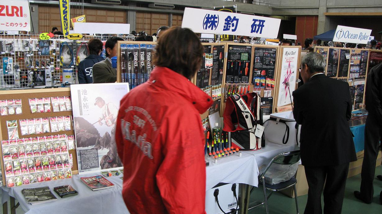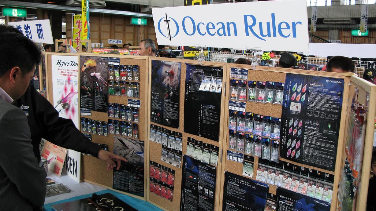 若い釣人達は、やはりオーシャンルーラーの方が気になる様です。ウキやハリスの展示より、新しく発売されるワームやエギなどを、熱心に見たり聞いたりしていました。