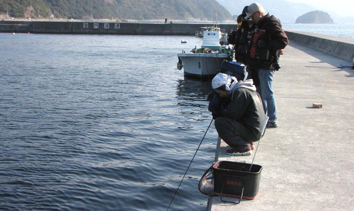 眞規子さんもアタリを拾い、アワセを入れたのですが、当て潮でハリスが岸壁の付着物に触れていた様で、カンダイにはダイレクトに力が伝わりませんでした。竿は曲がったものの、悔しいハリ外れ。