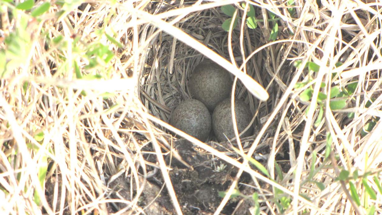 菜の花は散り始めていますが、春が一段と濃くなってきました。ノビタキを探していたら、足元からヒバリが飛んで偽傷して逃げています。それを放って飛び出た所を確認すると、卵が3つ有りました。