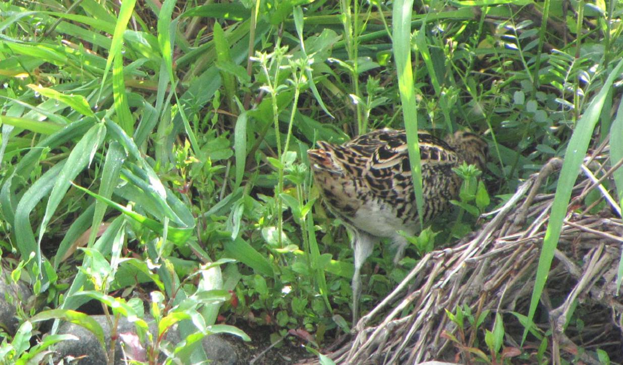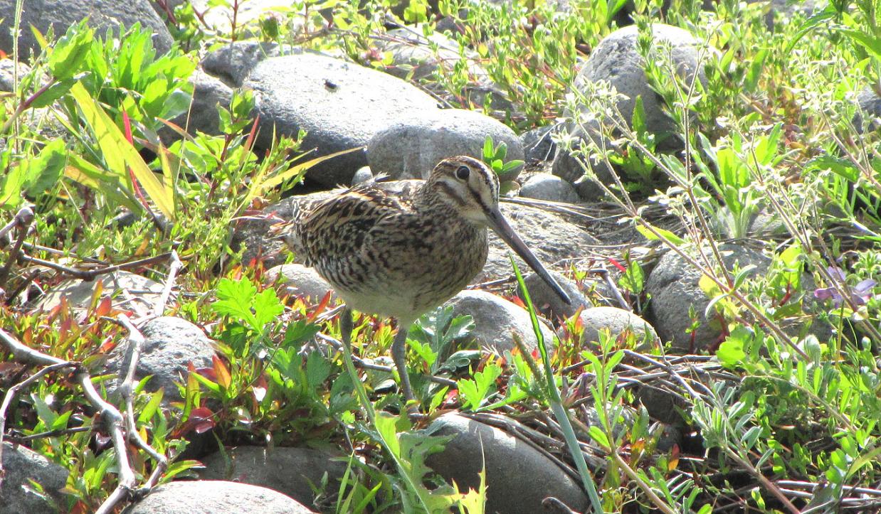ジシギはどちらかといえば夜行性です。でも人気のない河原で、草薮が近くに有ると朝夕はエサを漁りに出てきます。距離にして10mくらいでしょうか?こちらからは丸見えですが、草や木の葉で偽装された、カモフラージュネットの中の私には、気付くことなく草むらの中へと消えていきました。