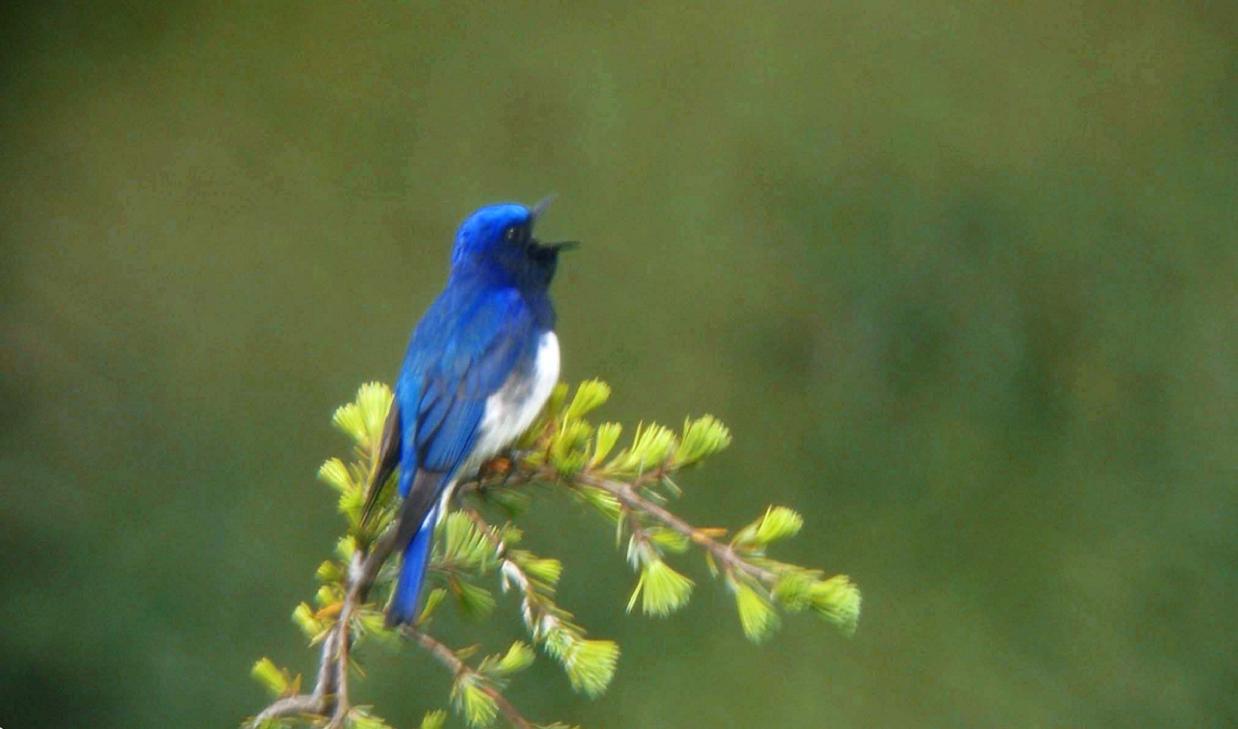 天体望遠鏡だから、オオルリが逆さまに映っています。130mも離れているのに、もの凄く近くに見えるオオルリ・・・本当に綺麗です。