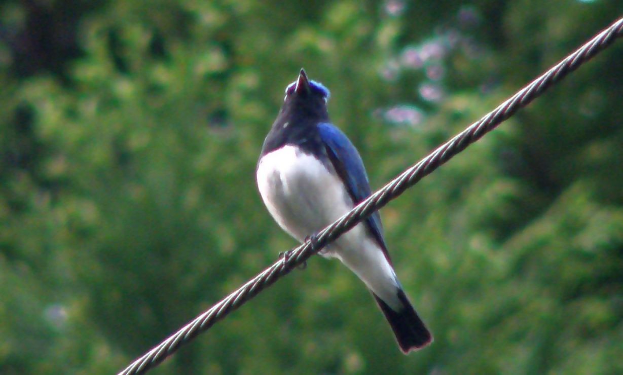 ・・・夕方の5時過ぎに山を降り、もう直ぐ民家という所でオオルリの声がします。杉木の梢を見上げたのですが居ません。なんと杉木の前にある電線に留まって鳴いていたのです。