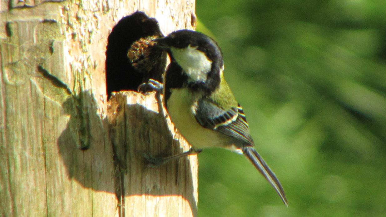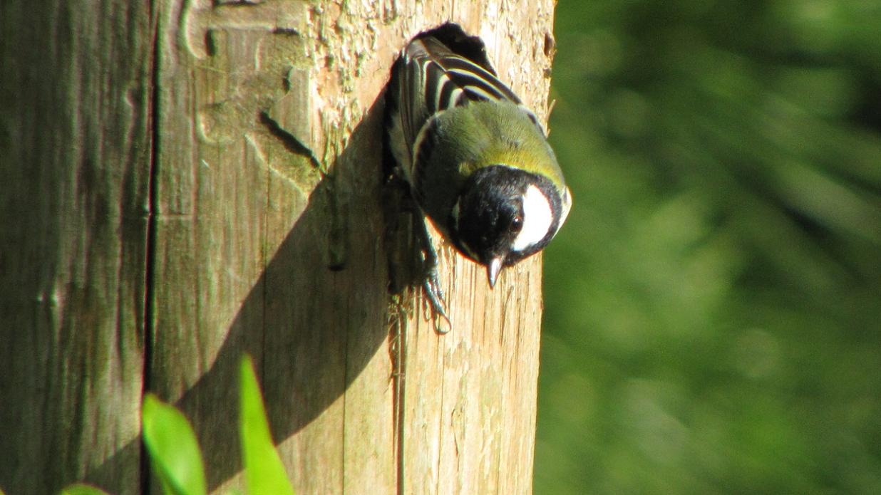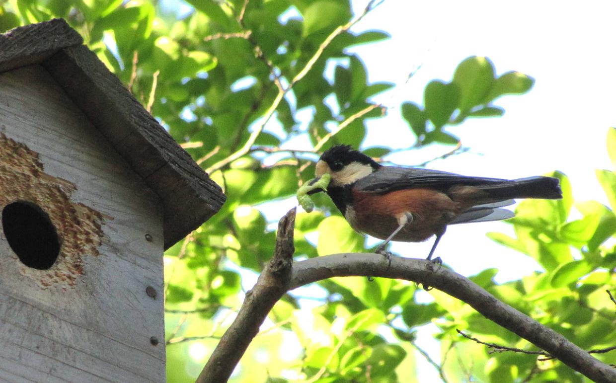 県民の森、日本庭園スポットです。巣箱を利用していたシジュウカラは巣立っています。ヤマガラの方は、一部巣立った感じで、時おり親がエサを運んでいます。
