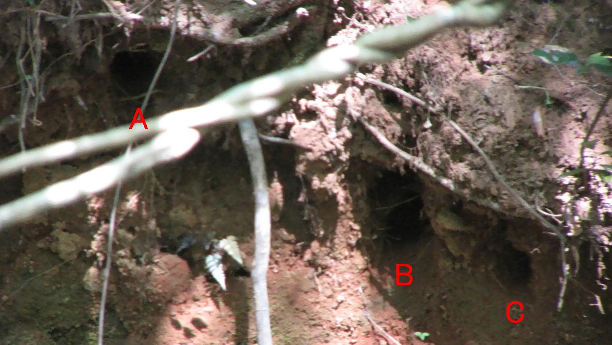 カワセミの巣穴、Aは古い巣、BとCは新しく、今はBを使っています