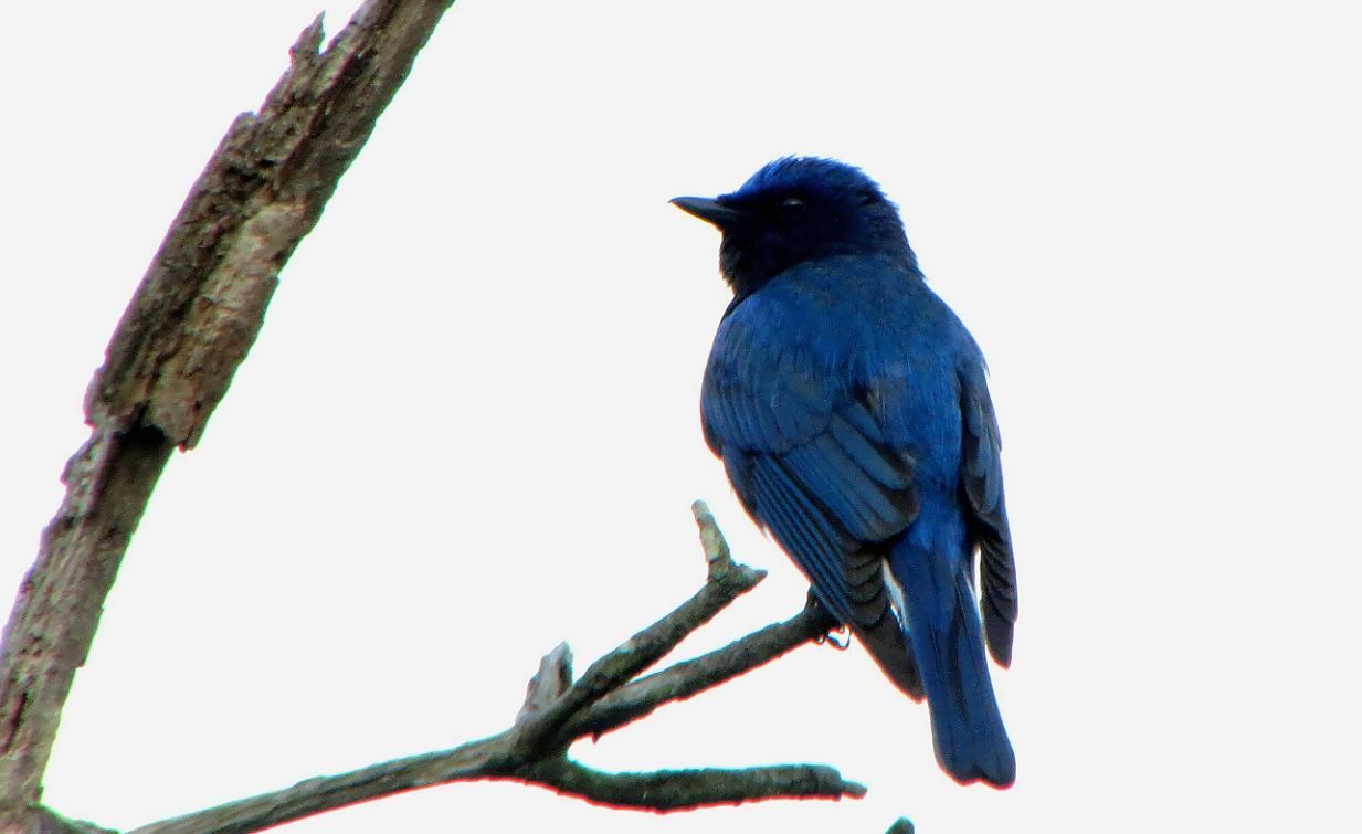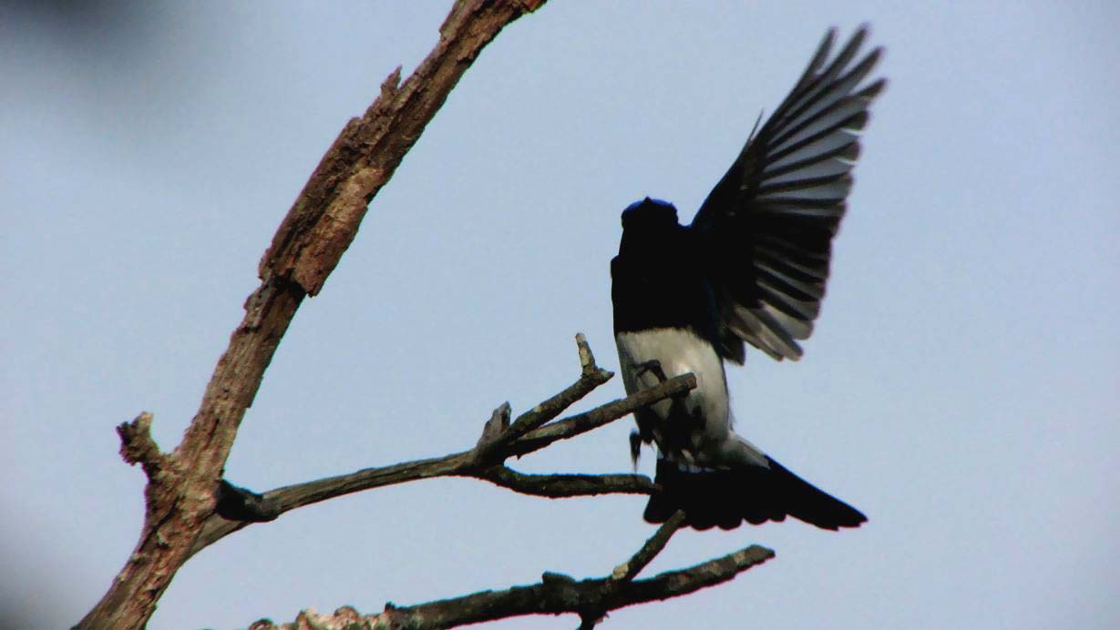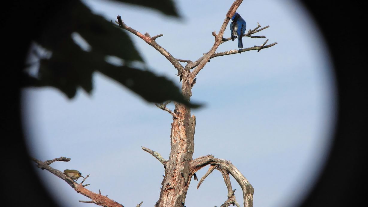 こんな感じで松の枯れ木を見ます。メジロと羽繕いのオオルリです