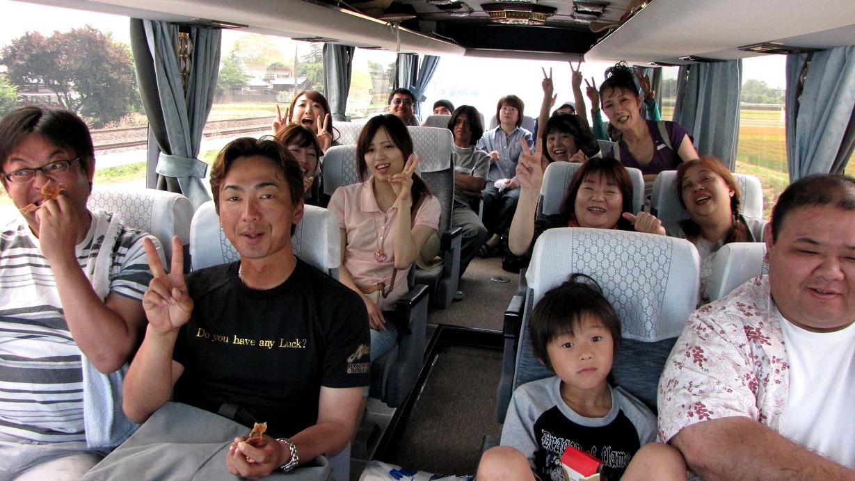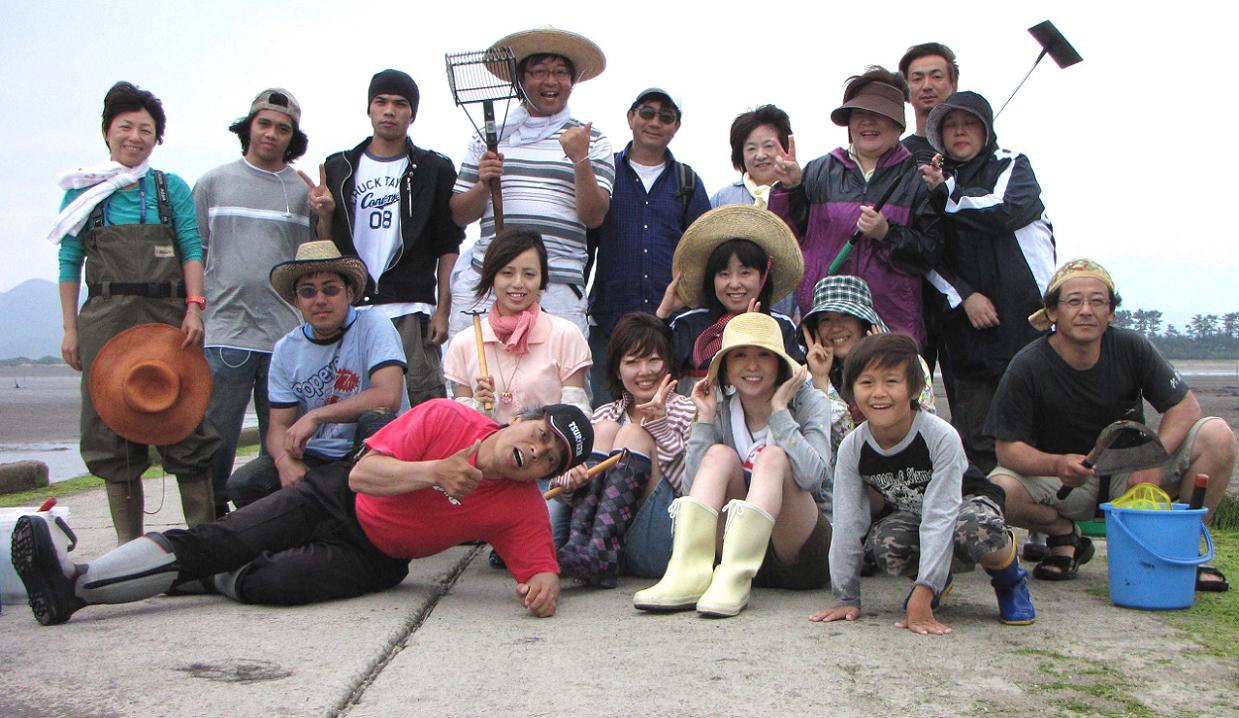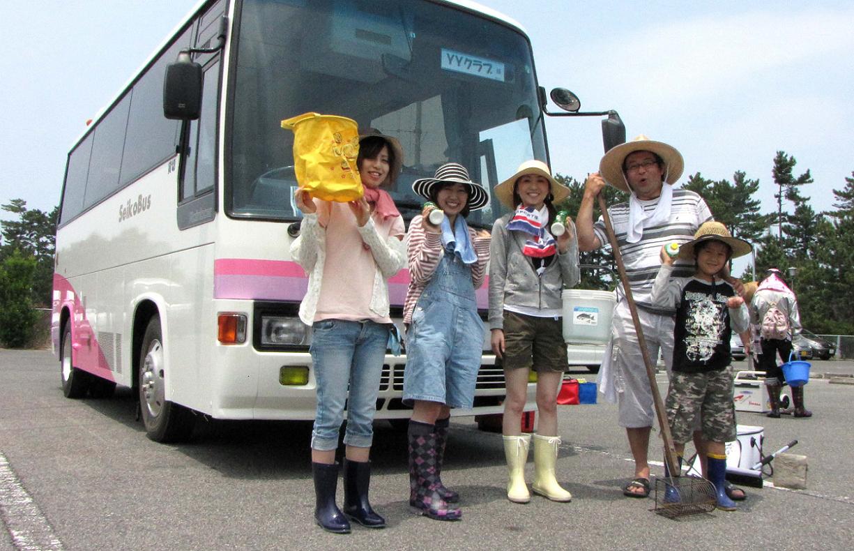 今日は、YY倶楽部主宰の貝掘りツアーです。小型バスに乗り込んだのは、釣り仲間・遊び仲間・仕事仲間達です。