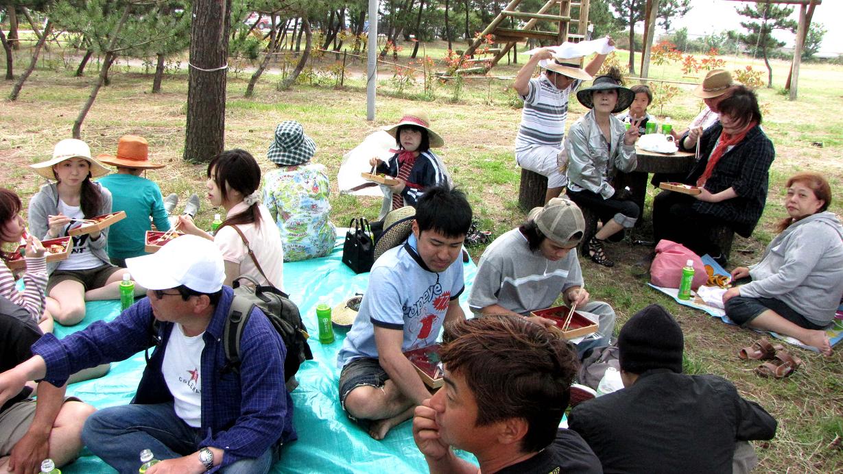 総勢20名が、USAのWAMA BEACHへと大挙して押し寄せて行きます。海岸の松林でエネルギーを補給後、いざ出陣。