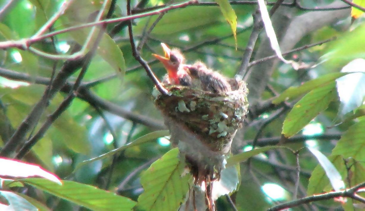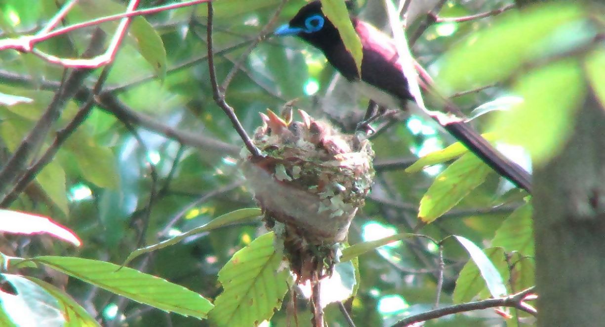 サンコウチョウが誕生して今日で7日目、4羽の雛は順調に育っています。昨日見た人は、2羽のカラスにサンちゃんがアタックしていたのを目撃しています。