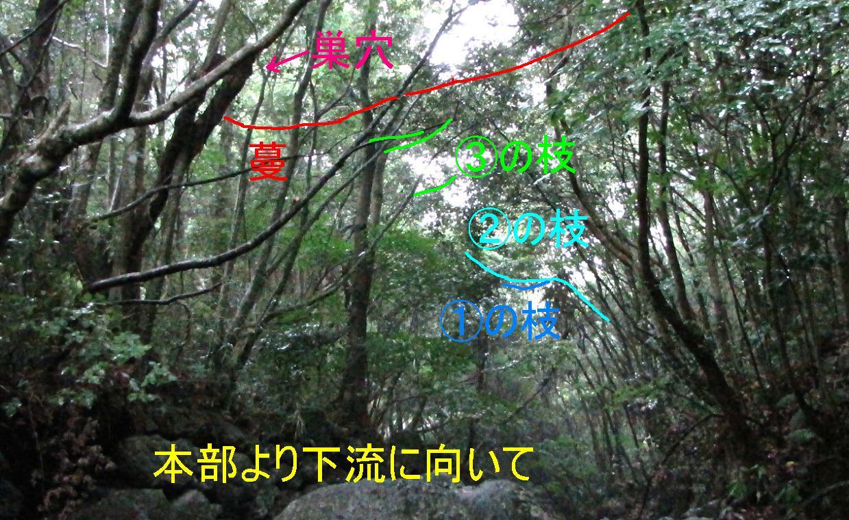 アカショウビンの巣と主に使う枝など ①②は15mくらい下流
