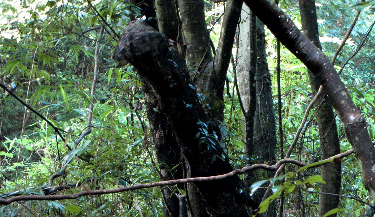 雨天が続いたため、巣の上流側の枯れた幹(直径約30cm)が、昨夜の内に折れてなくなっていました。巣として利用している方は、雨水侵入防止措置をしているので無事。枯れ木は雨が多く降ると、雨水を吸い、その重さに耐え切れなくなって折れて落下するのです。巣のある幹は、なんとか耐えてくれました。