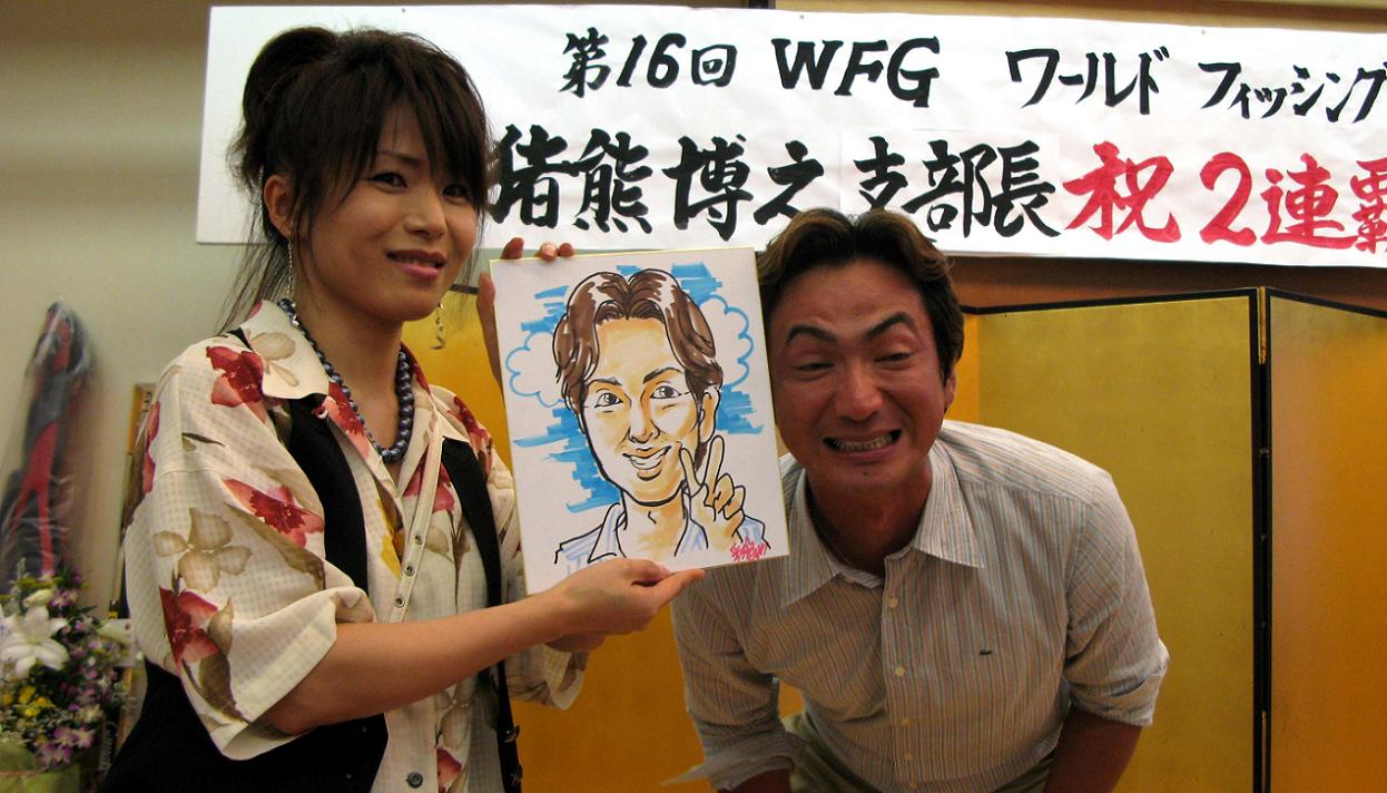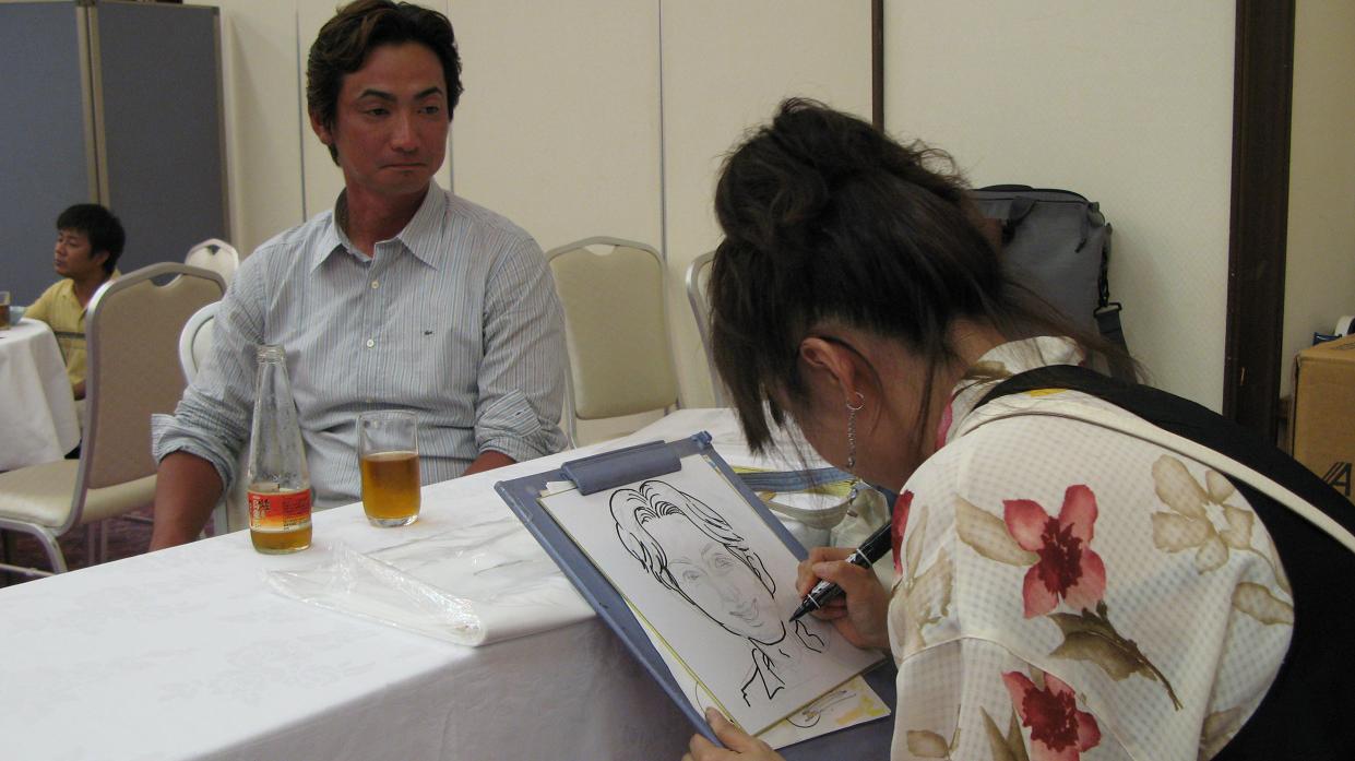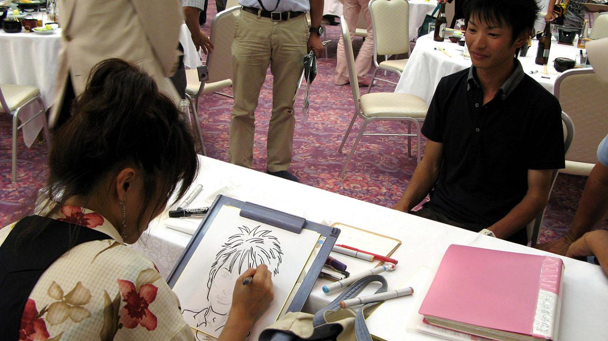 アトラクションは釣研からのプレゼント、似顔絵描きが始まります