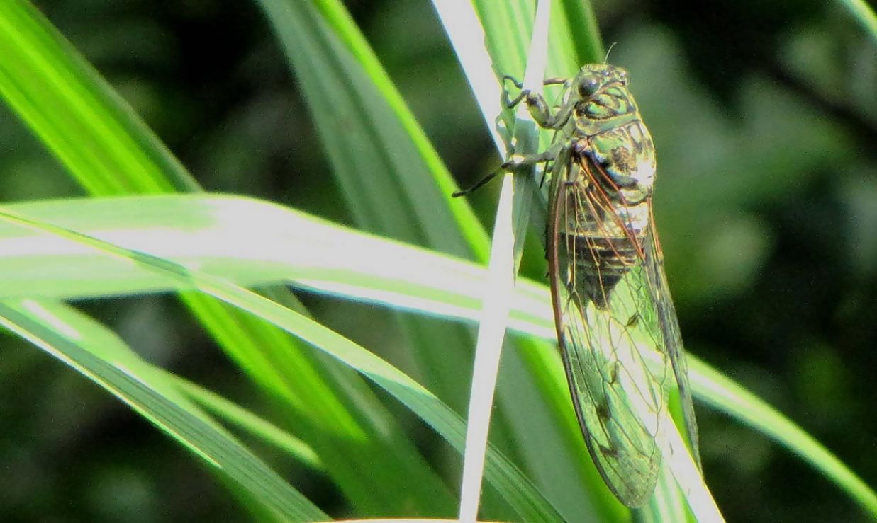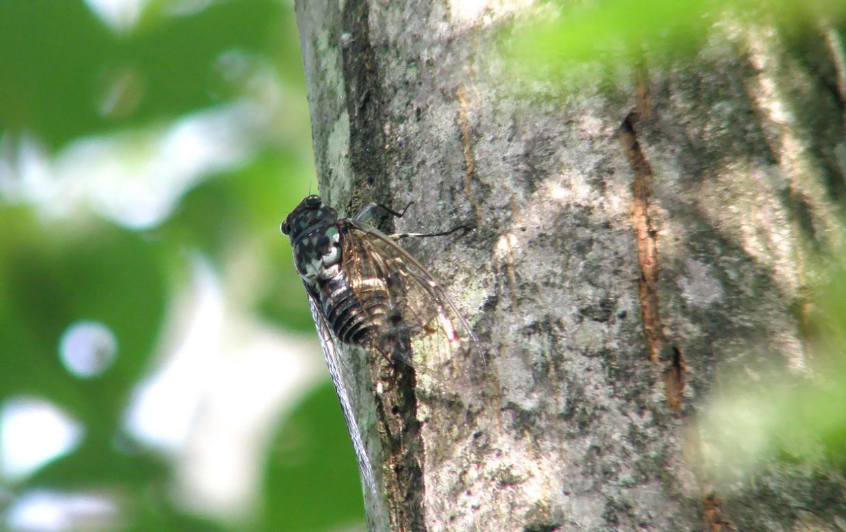 ミンミンゼミはセミの中では警戒心が強いので、近付く事が困難だし比較的木の上の方に居るので見つけ難いのですが、このオスは鳴くのに夢中でかなり近くでの撮影に成功しました。大きさはクマゼミと同じくらいですが、体が緑色で羽根が透けて見えます。体の幅はクマゼミより狭いのでスマートに見えます。