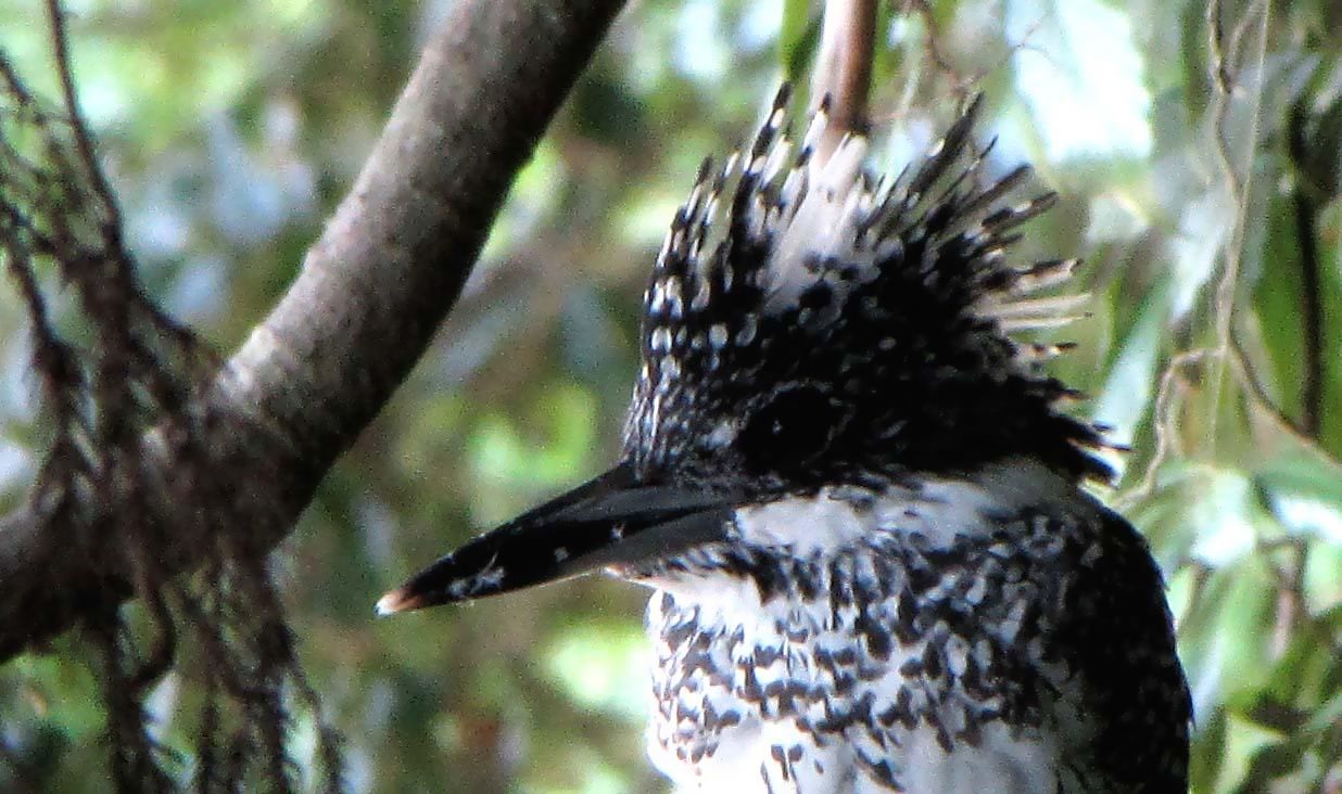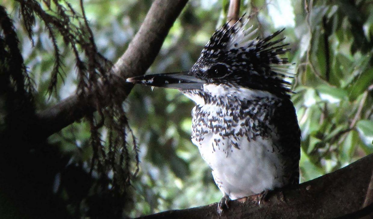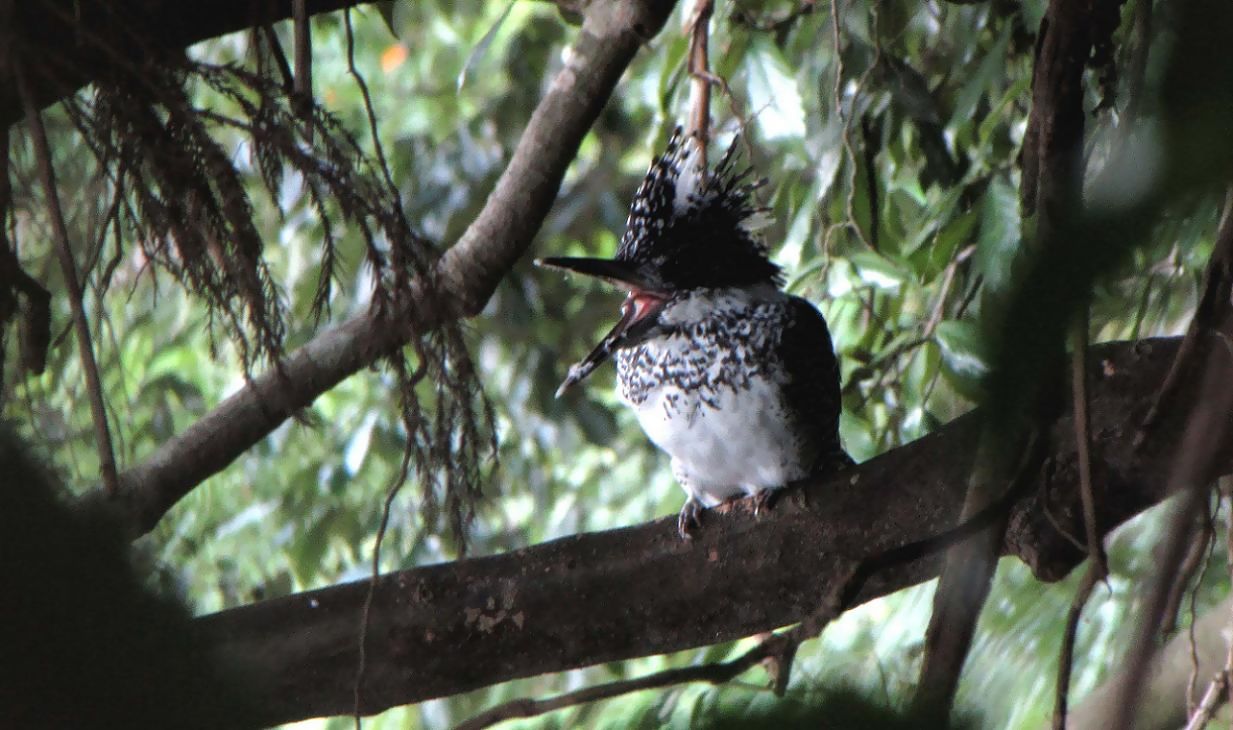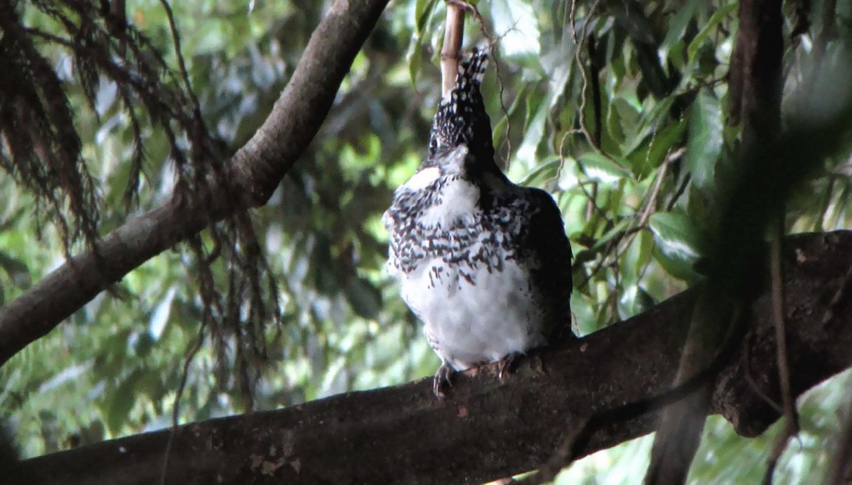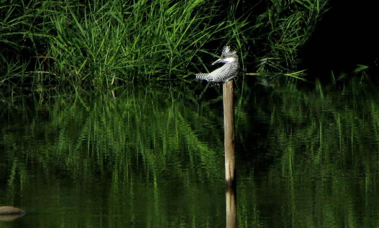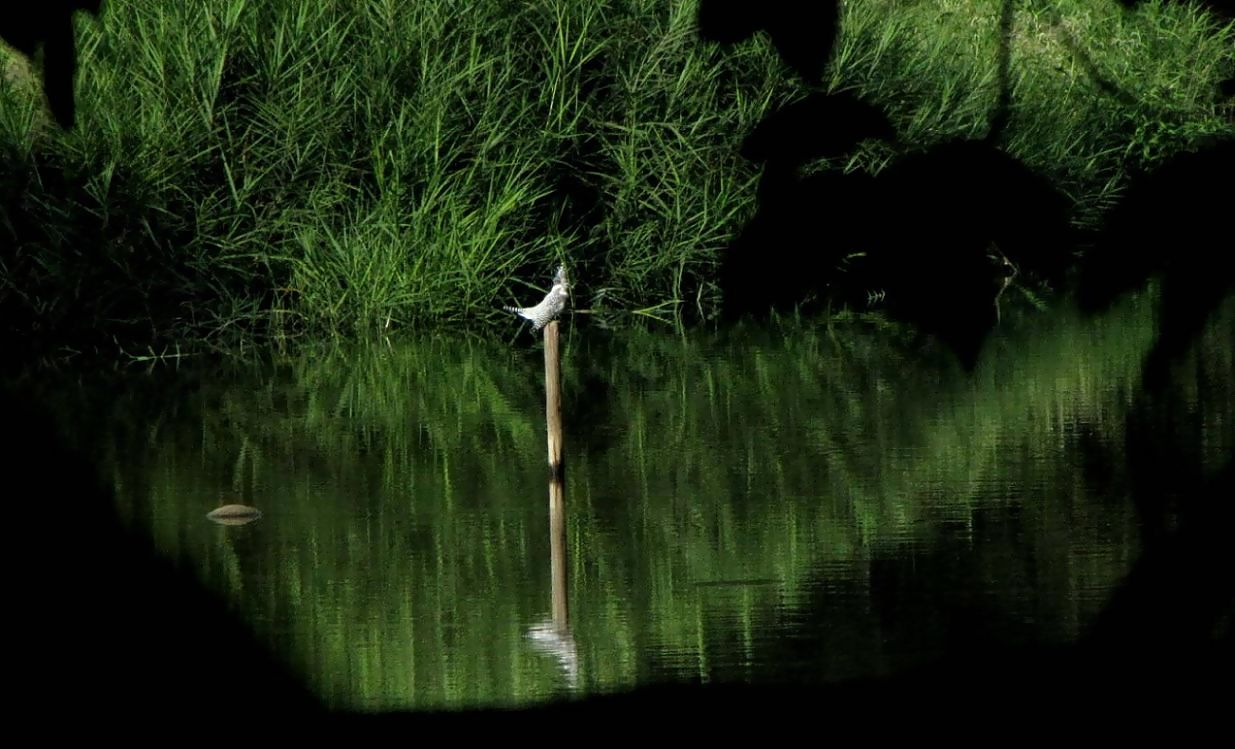 一通りダイビングしたら、今度は私より下流のすぐ傍の木に来ました。狙いの木より3m下流の上の枝、その手前には葉っぱが沢山あって、ほとんど見えません。諦めて見ていると、今度は私の少し上流側に移動してくれました。