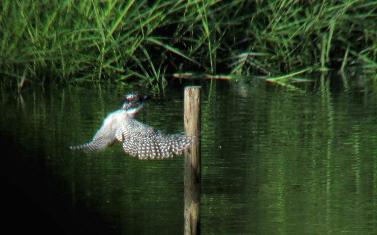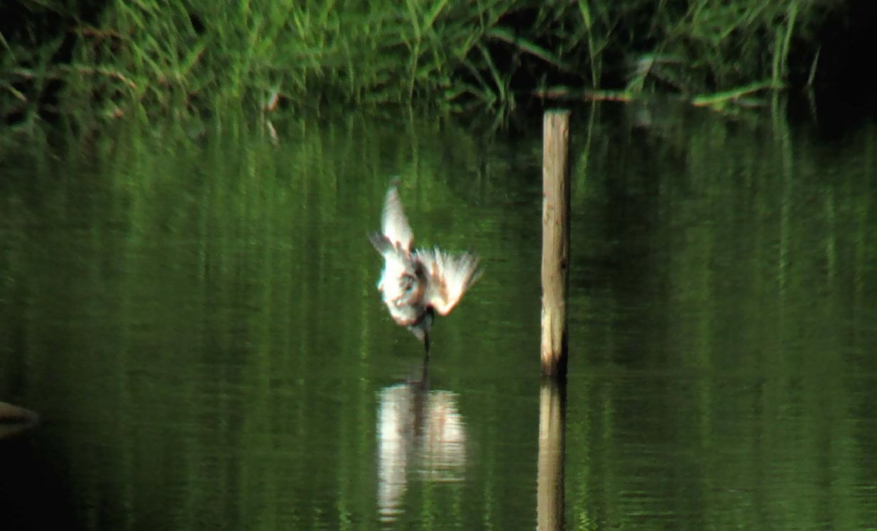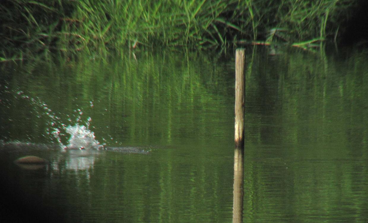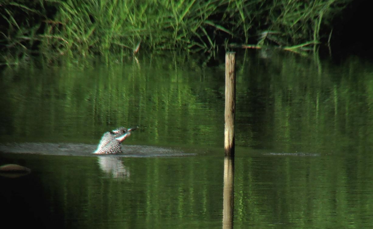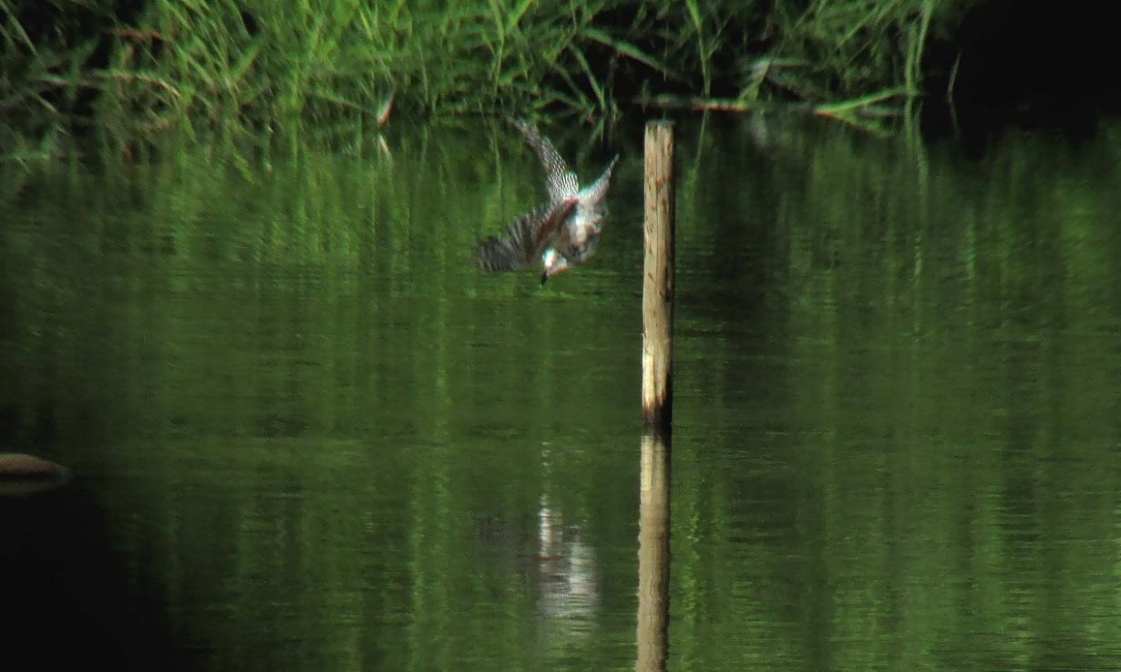 ず~っと来なかったのですが、上流で時々鳴いています。9時過ぎ、70~80mくらい上流の川の中にある杭に留まりました。相当に遠いです。撮っているとダイビングを始めました。杭のある部分は浅瀬です。でも何度も何度もダイビング。若の練習なのでしょうか?