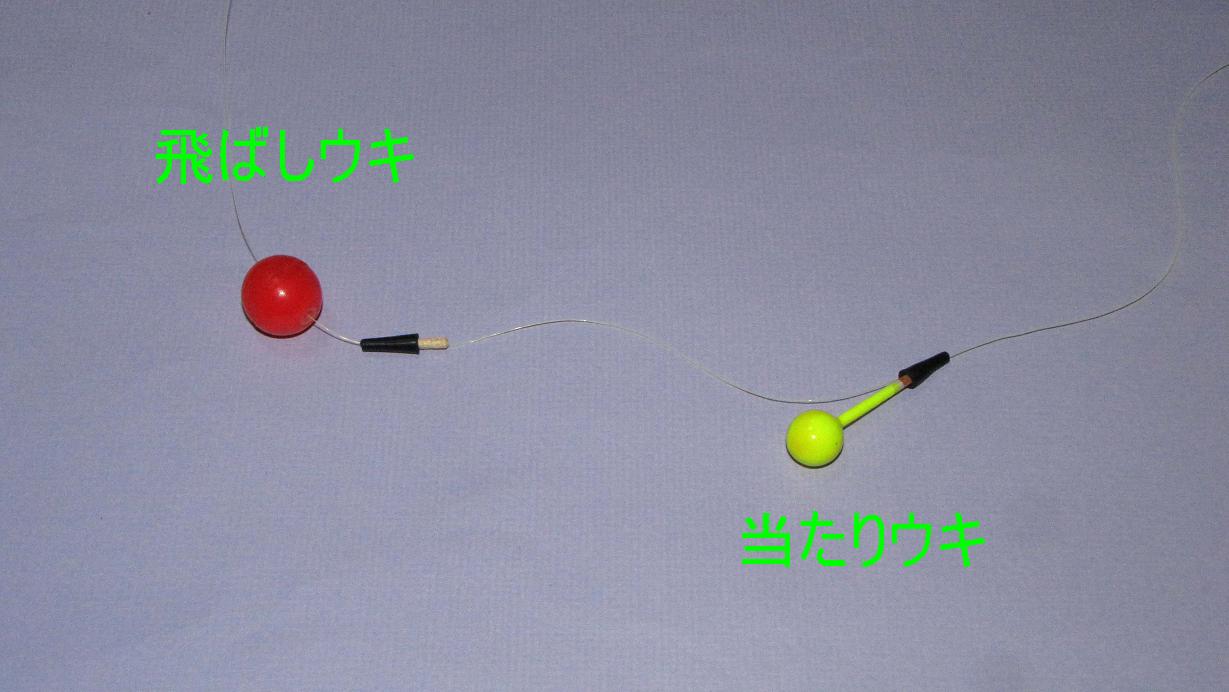 イシダイ竿を持たずに、グレだけを狙った時に使用したのがこの写真の仕掛けで、ゴム製の飛ばしウキと足つきの木玉ウキです。・・・当時の飛ばしウキはあまり大きくはなかったことを覚えています。このウキでグレを狙っていました。