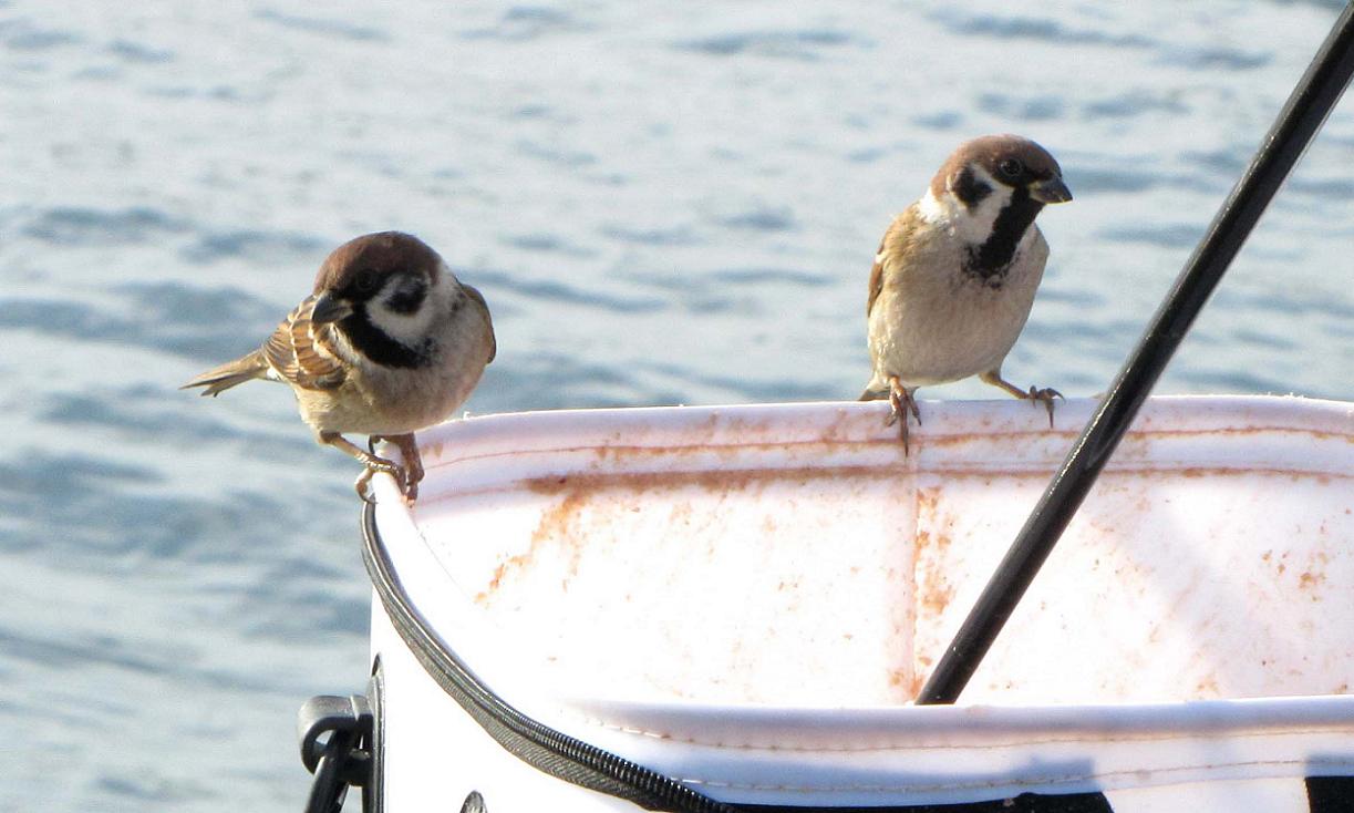 向かい風になってからは、白灯台の内側に移動です。マキエに集まったのはスズメ。少しだけおすそ分けしてあげて釣りを再開です。地元のおじさん・おばさんに混じって、かなり若い女性も釣っています。更にエギンガーも2名ほど。