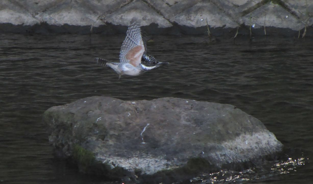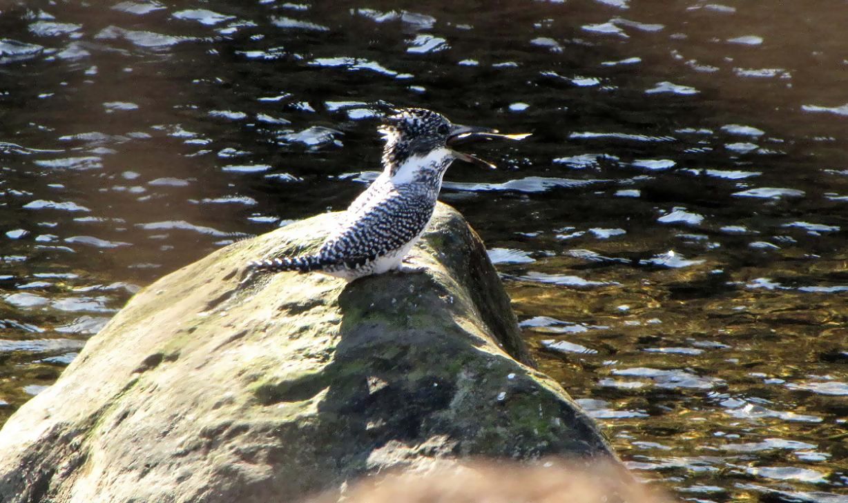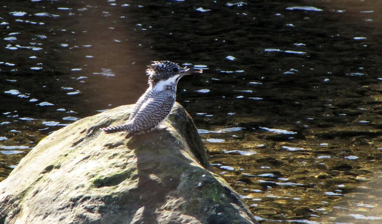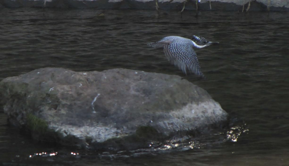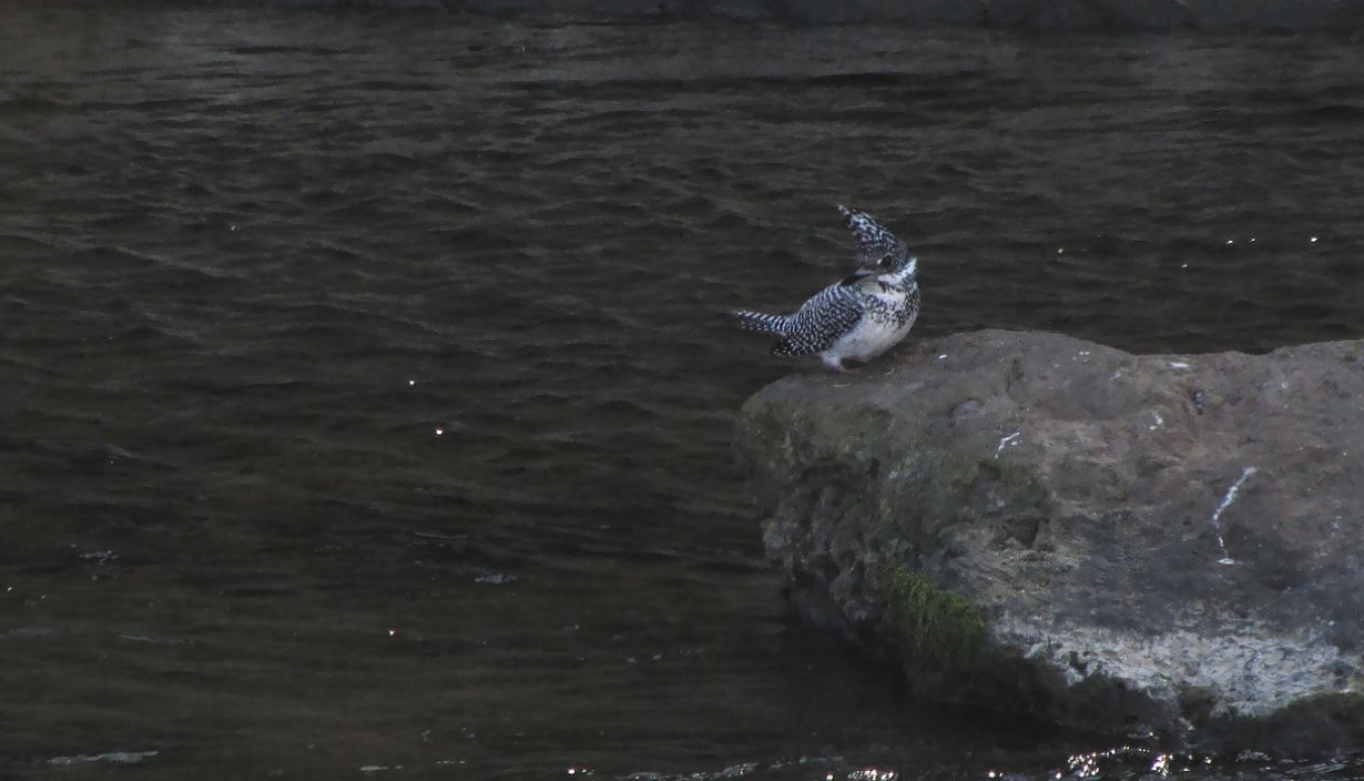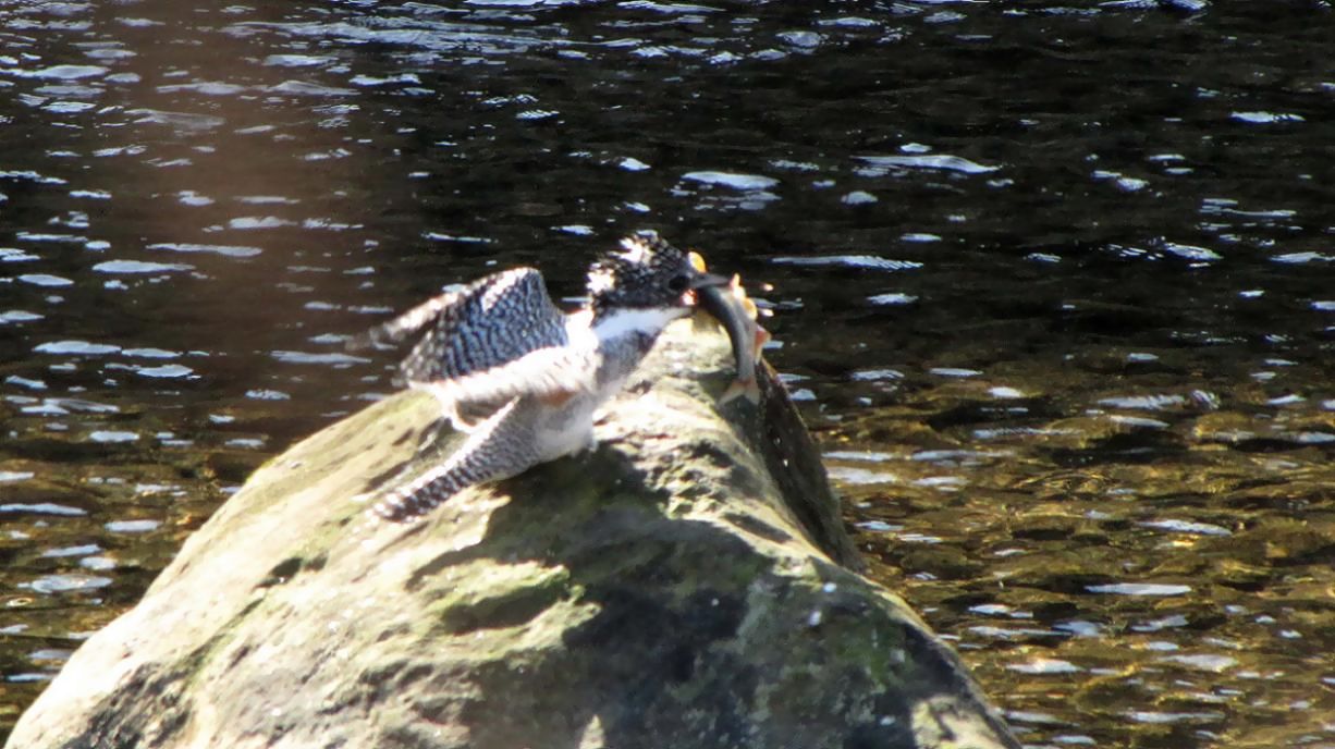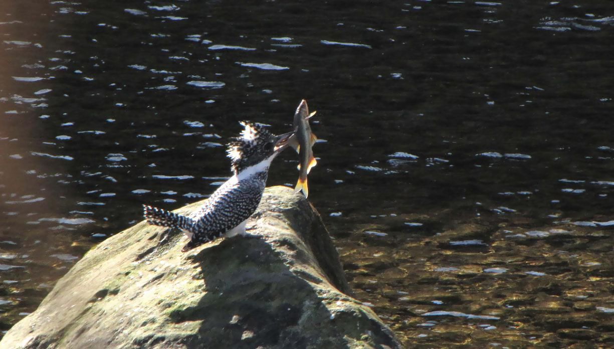 雪で到着が遅くなり、今日は不発??と思っていたお昼ごろ、彼女はやってきました。いつもの枝に留まり、石に留まり、更に上流の枝に留まってダイビング。彼女は見事なアユを捕らえていました。