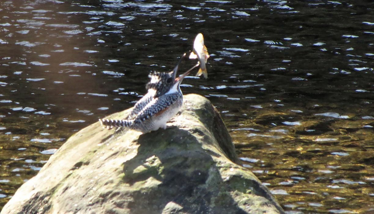 上の嘴はアユに刺さっていたので、以前の様に空中へとアユをほおり投げて、呑み込めるようにキャッチ、大きなアユを丸呑みです。