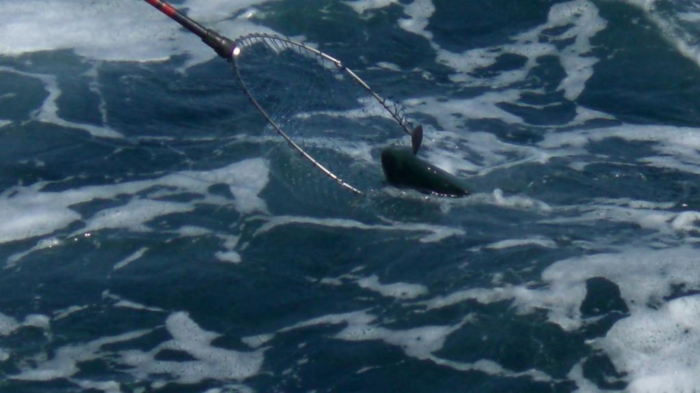 お魚さんを掬う時にはタモ枠を海面に入れるのは半分まで!!入れすぎると抵抗が大きくなるので掬いにくい。上手な人は少しだけ海中に入れて掬う。コレでもウネリがあって、2m以上は海面が上下していた・・掬い主は猪熊君じゃ(^o^)/