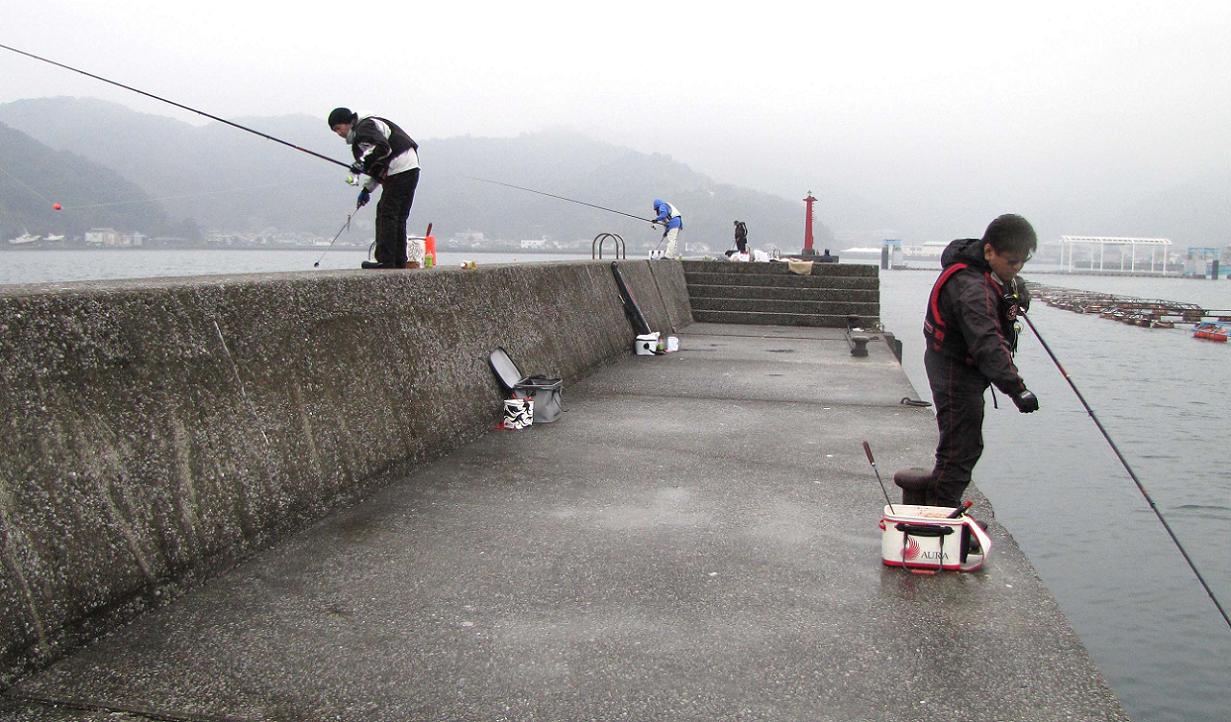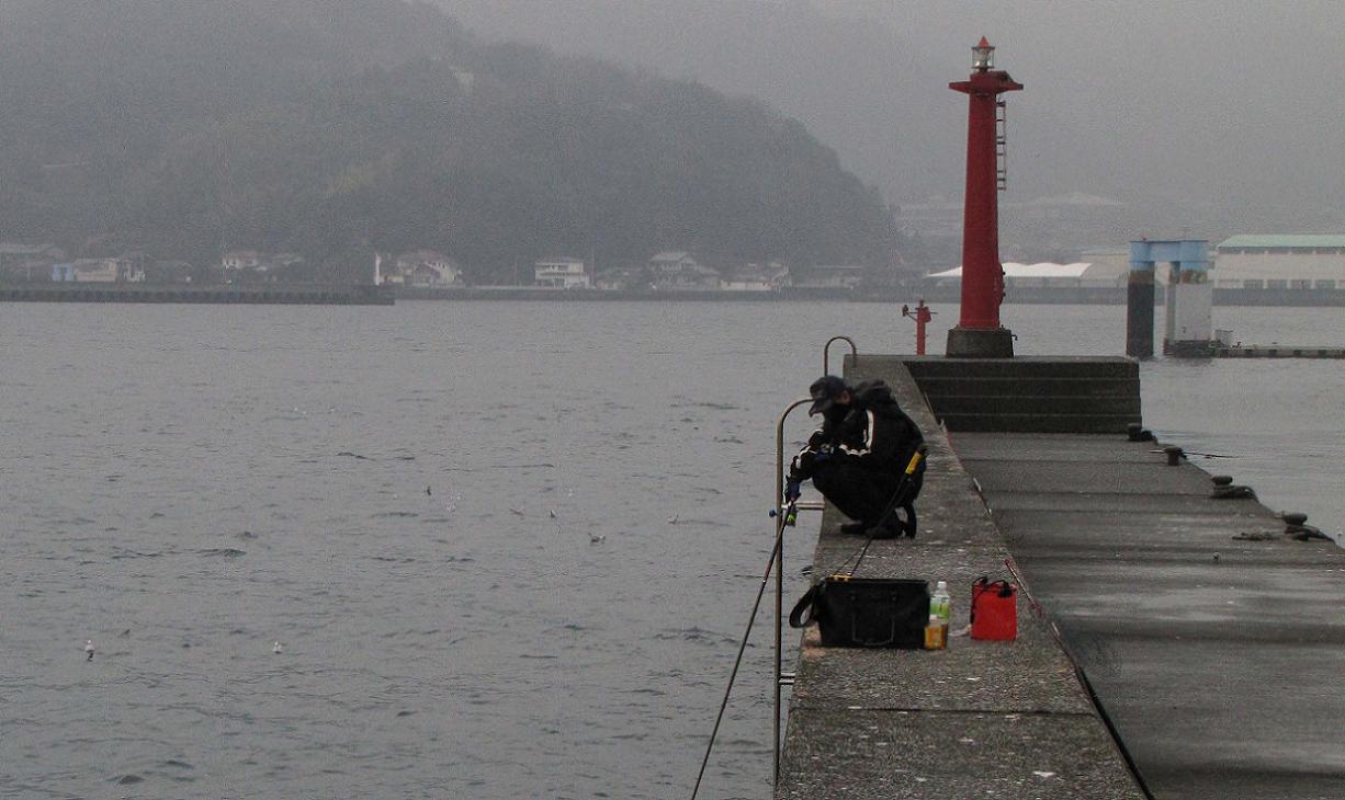 今日は雨の落ちる予報でした。大分市内より佐伯市内の方が雨は少ない予報だったので、鶴見漁協の防波堤でカンダイを狙いました。