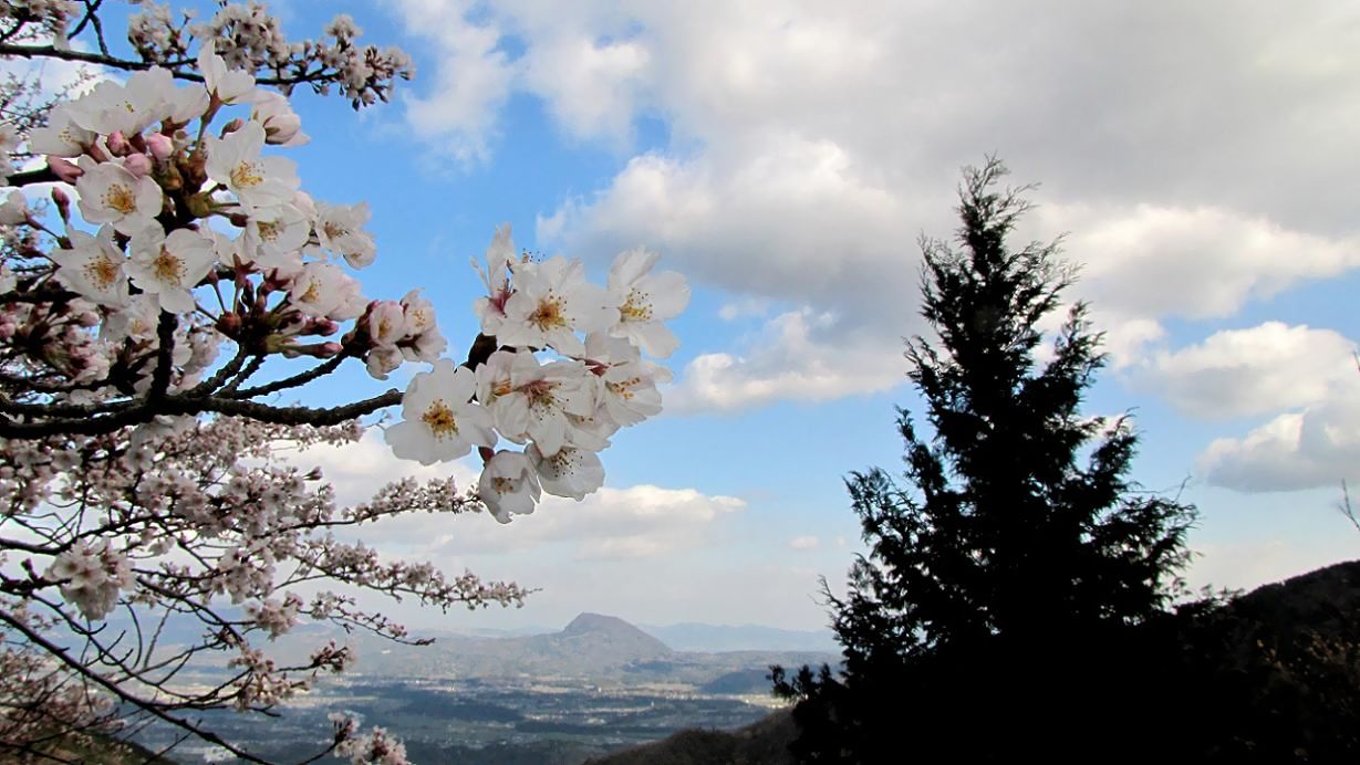 おサルの山、高崎山をバックに綺麗なソメイヨシノ