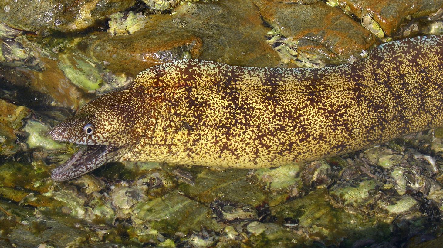 早速撮影、頭をチョンと叩くと口を開けて威嚇する。チョン・パシャやってウツボらしい絵を撮ることが出来た。←真似しないで!
